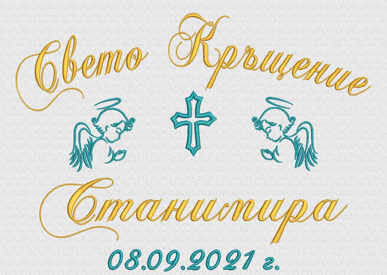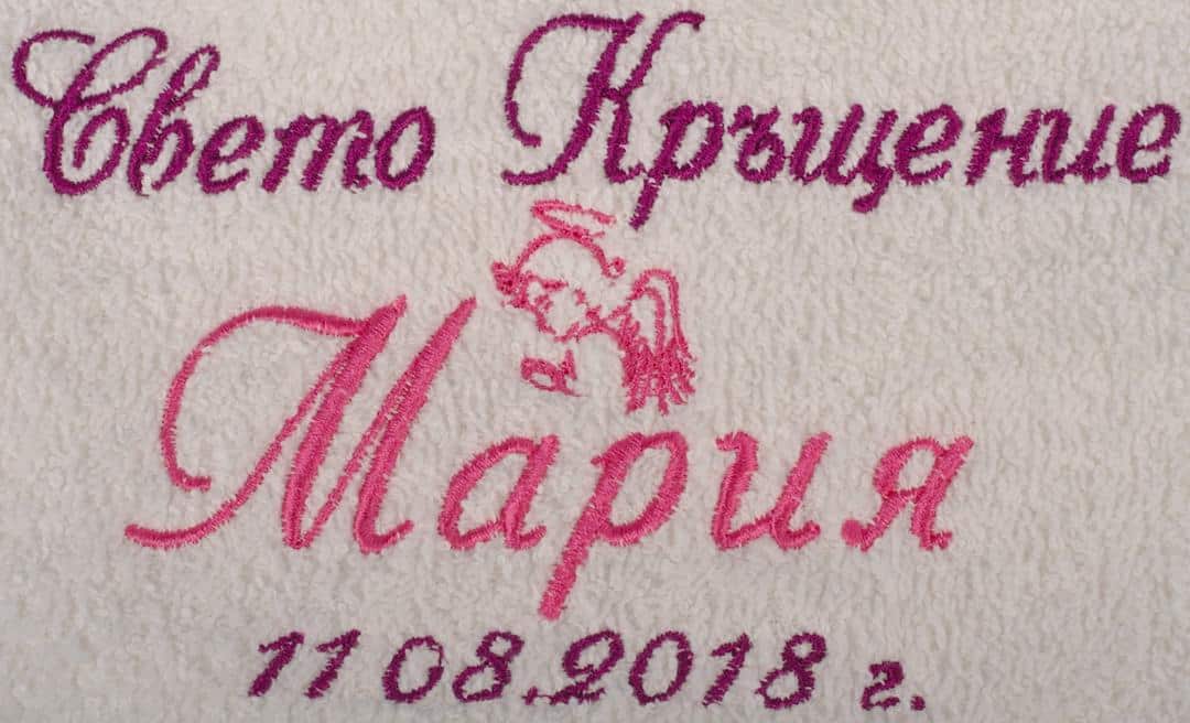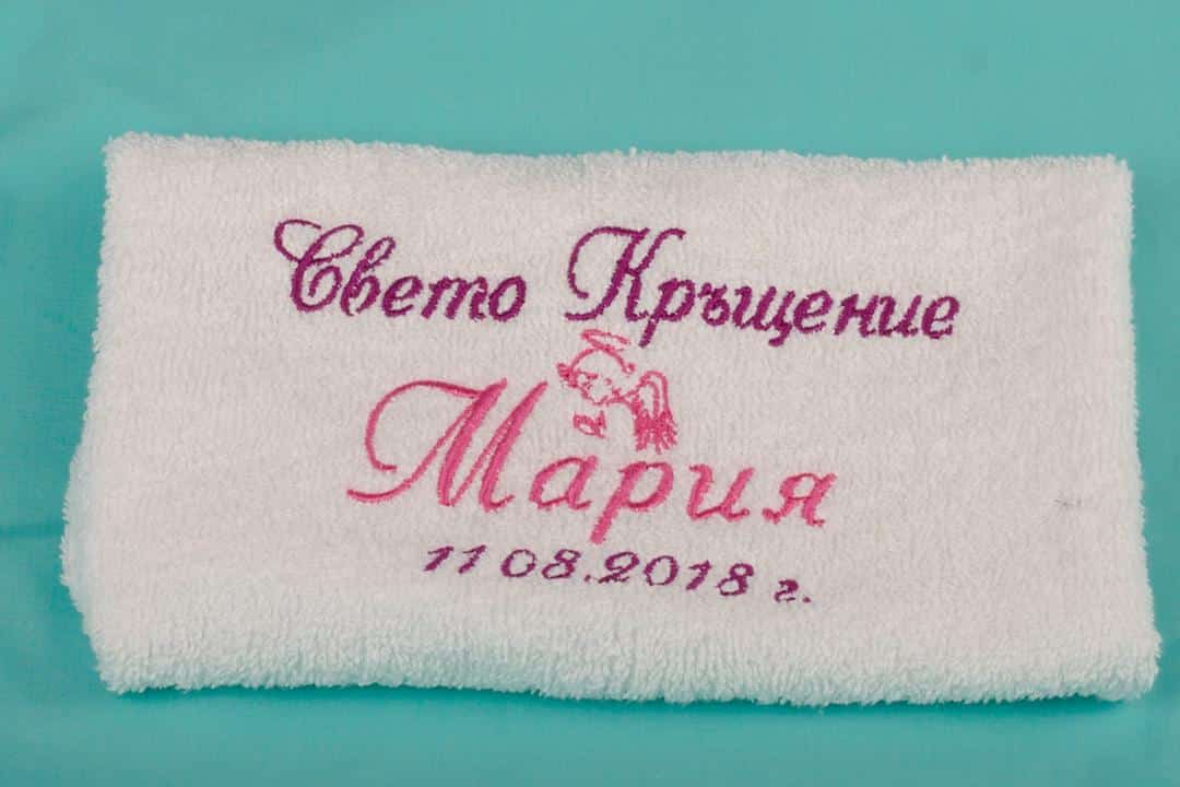 Хавлиена кърпа за кръщене с тематична бродерия за кръщене. Кърпата е бяла на цвят, изработена от 100% пакистански памук. Цветовете за бродерията са по избор на клиента. Научете повече детайли за компютърната бродерия.