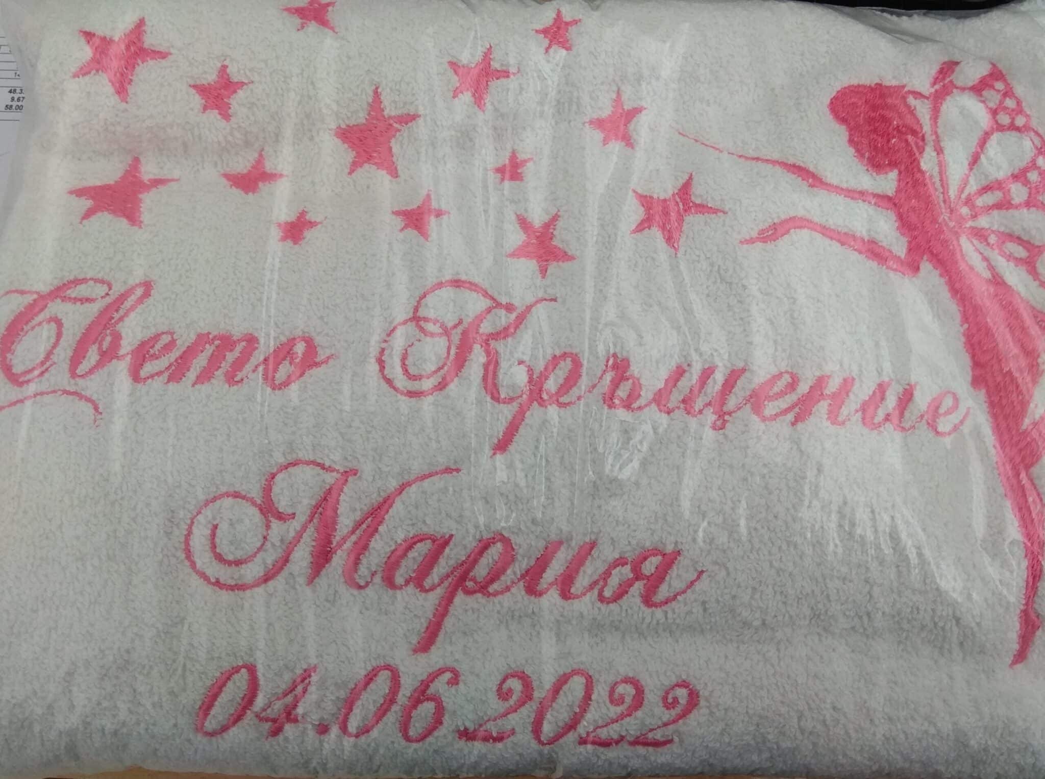 Хавлиена кърпа за кръщене от 100% памук, бяла, с тематична бродерия за кръщене. Посочената цена е готов продукт с включена бродерия: