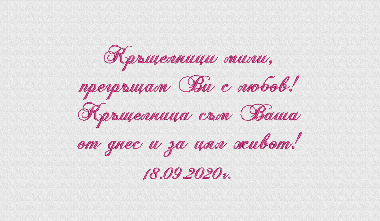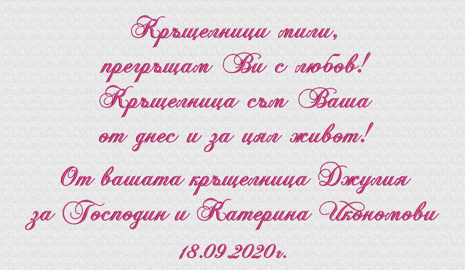 Моля, консултирайте се с нас относно срокове, възможност за избор на различна бродерия и цветове на конци: тел. : 089 552 7512.Вашите запитвания може да изпратите и на e-mail: eshop@tiki-bg.com.