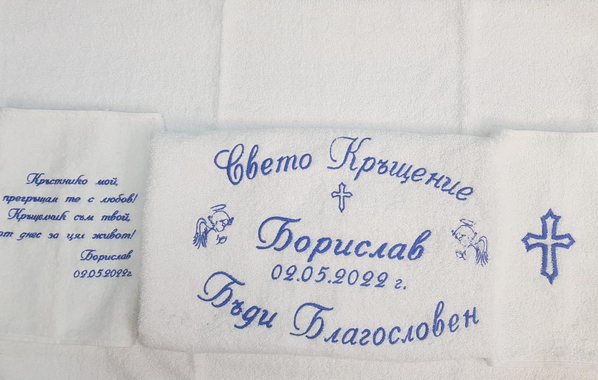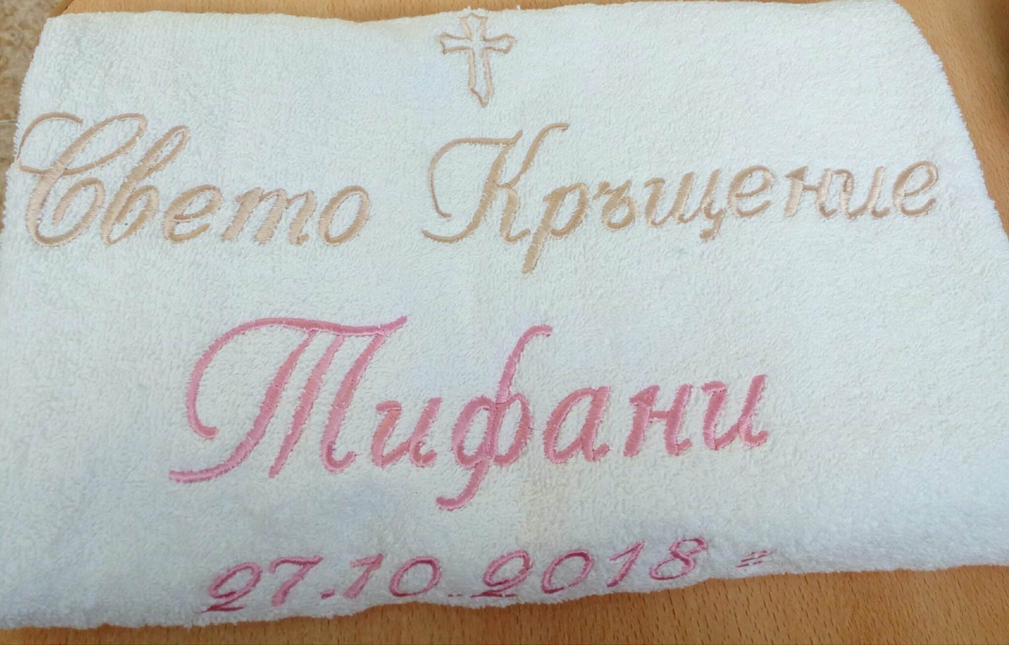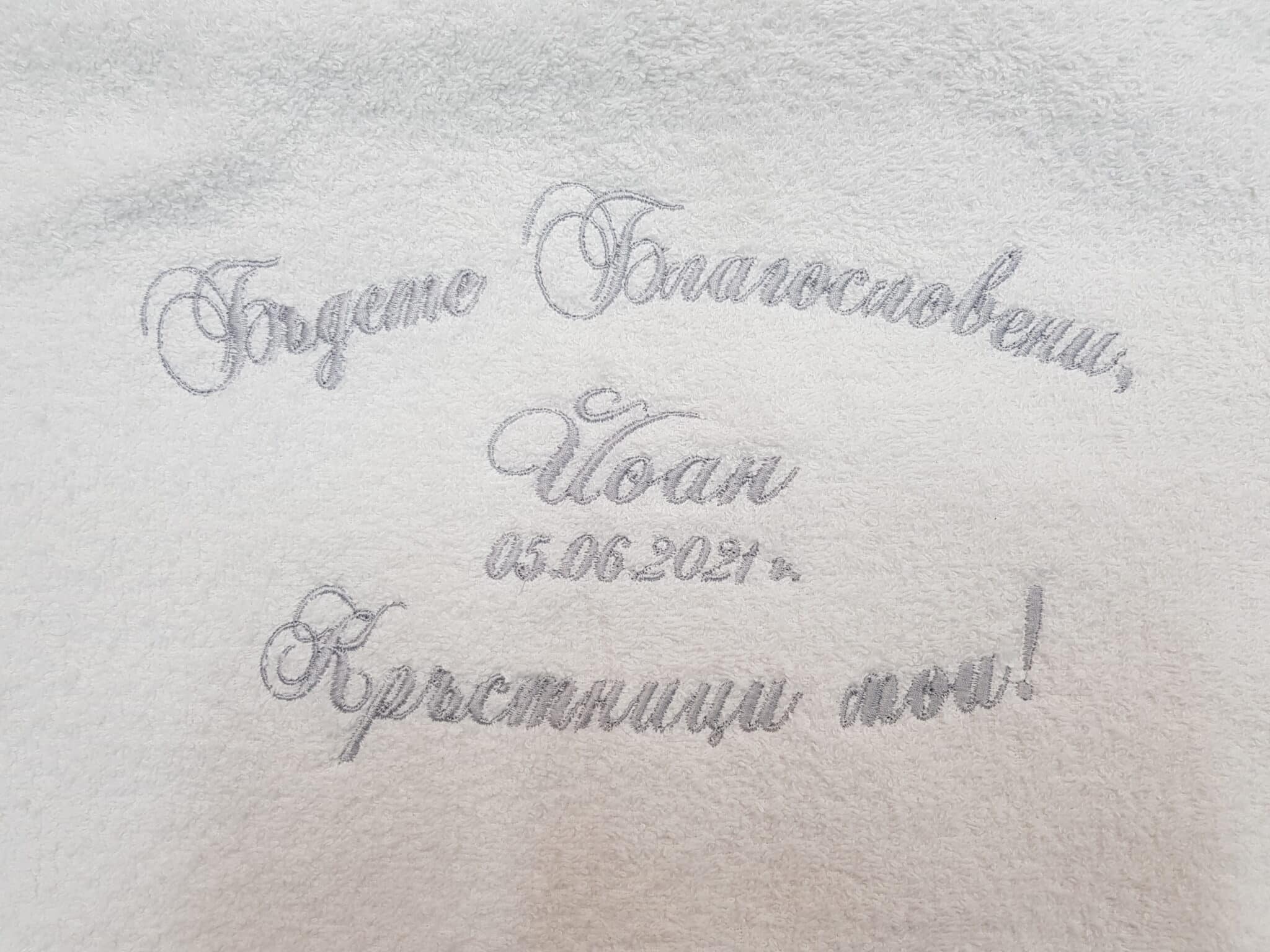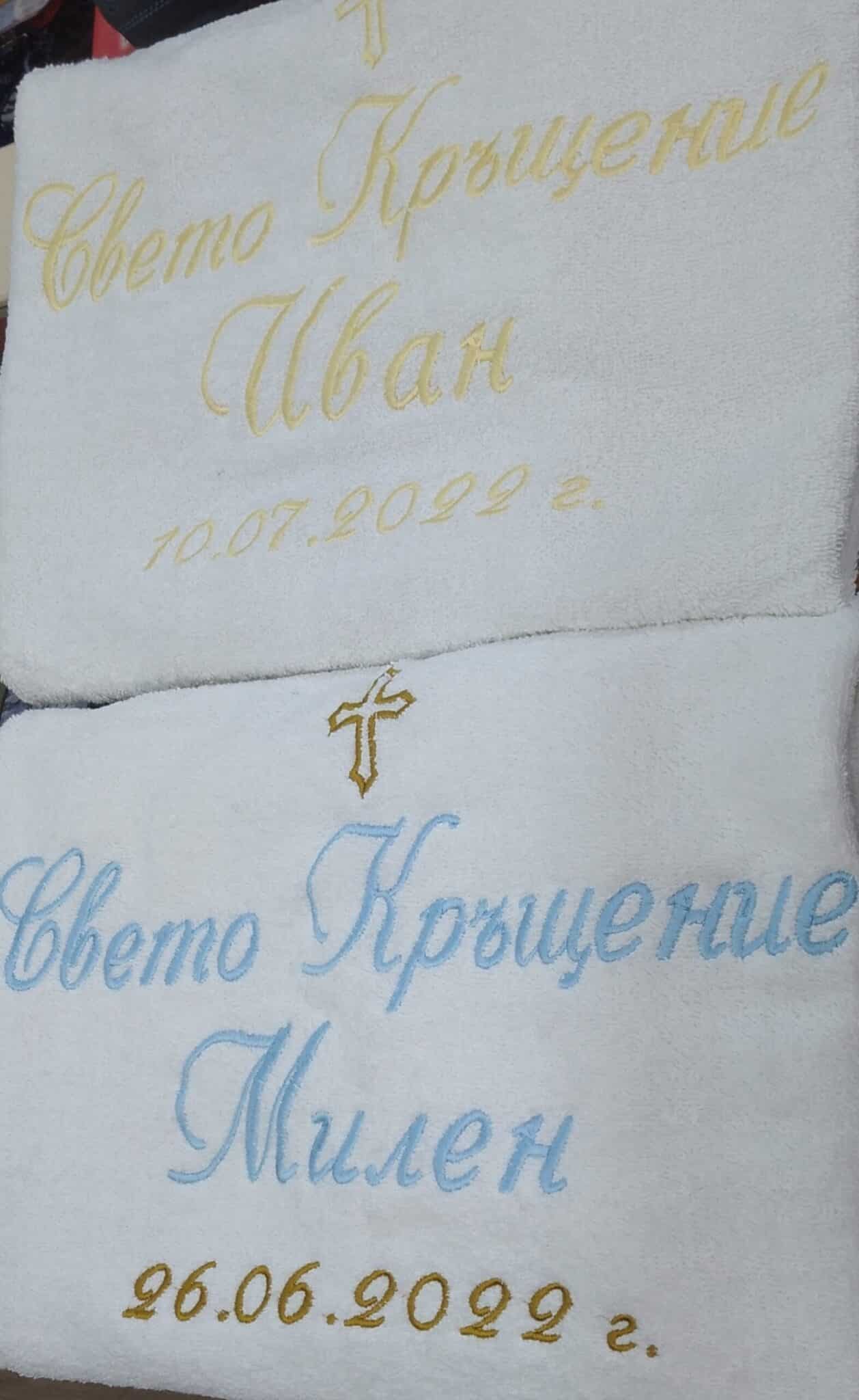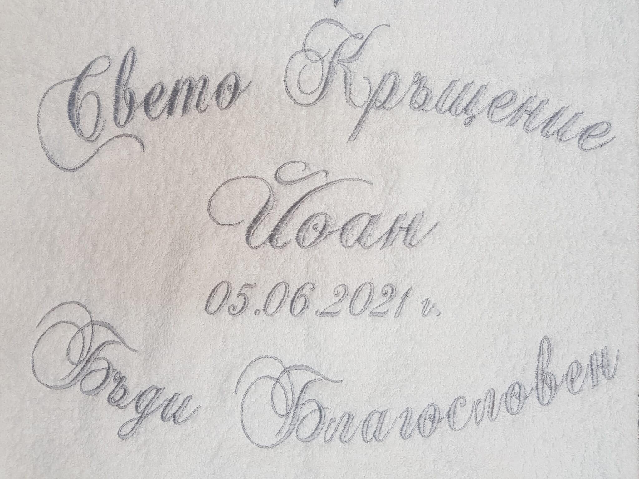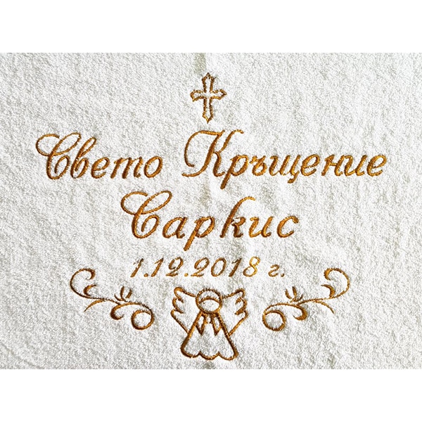 Избирате цвят на конците и стил на шрифта, така че вашата хавлия с бродерия да бъде уникална и съобразена с темата на събитието. Цветовите комбинации се изработват по заявка и позволяват пълно съответствие с останалите елементи от комплекта за свето кръщение.
