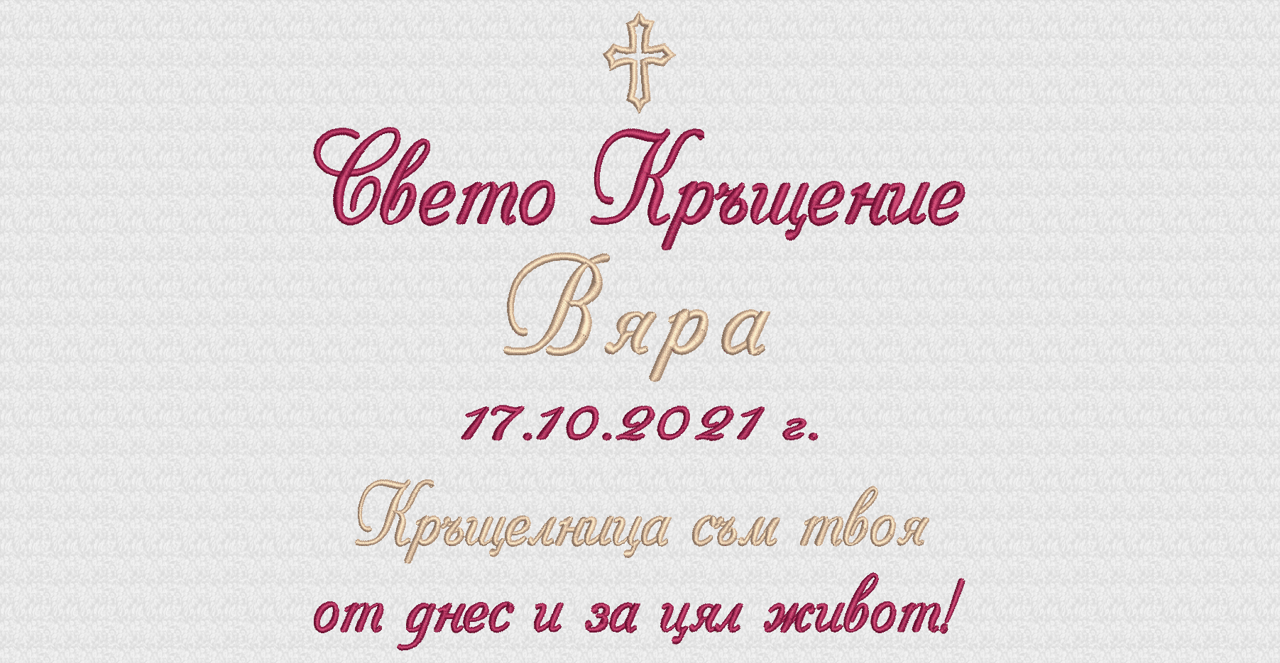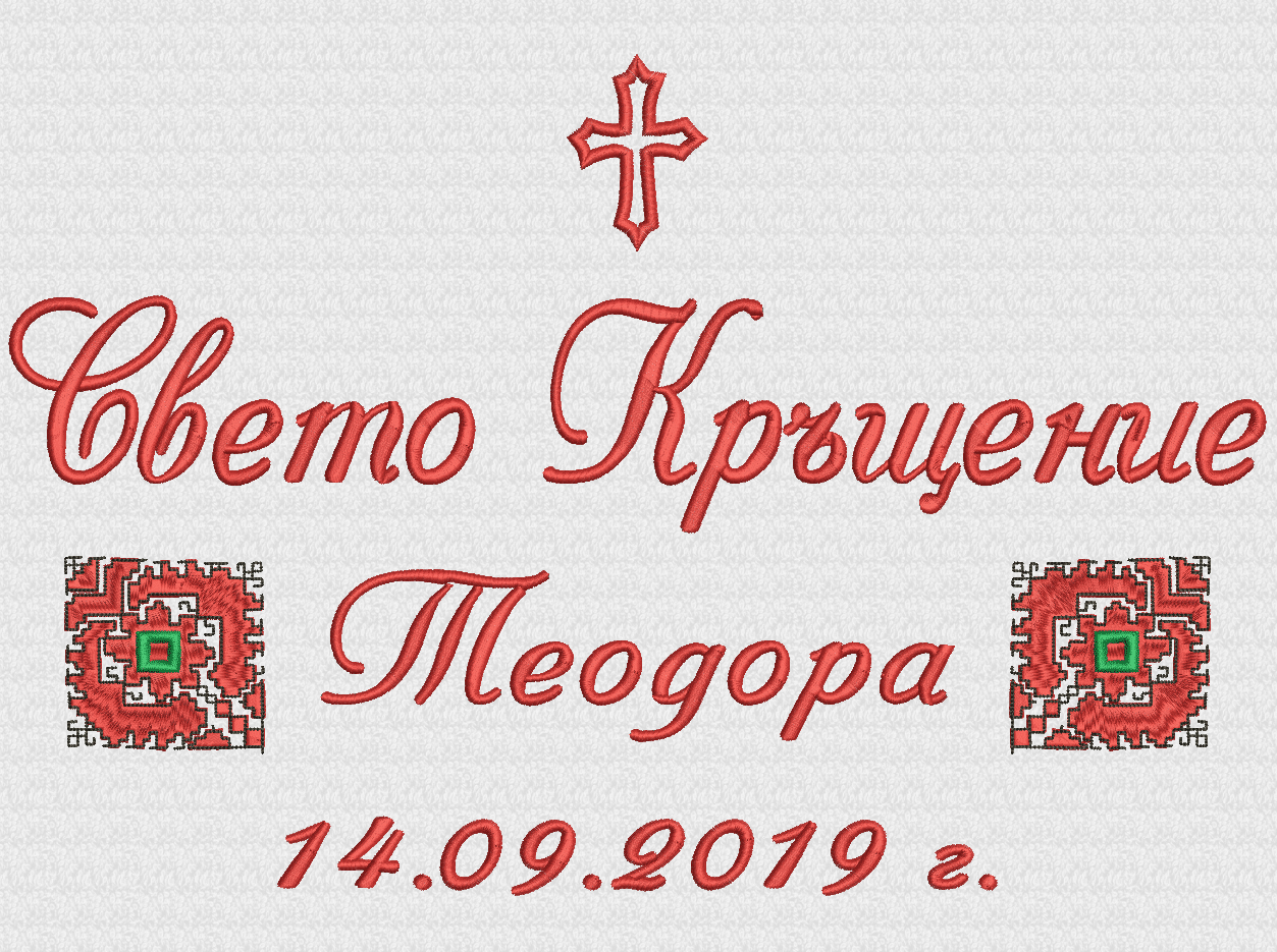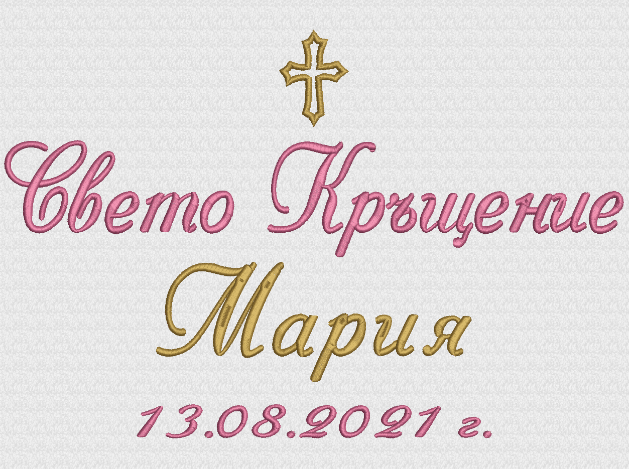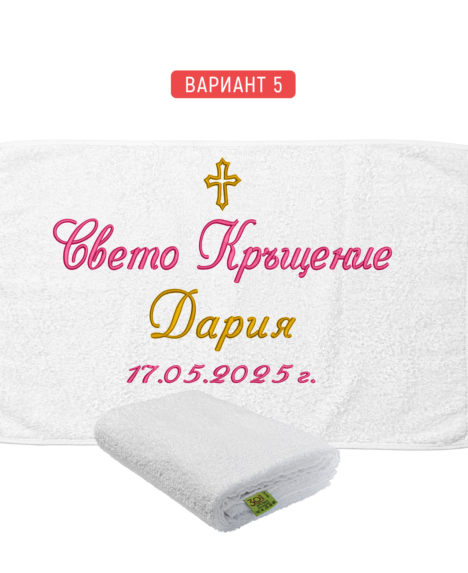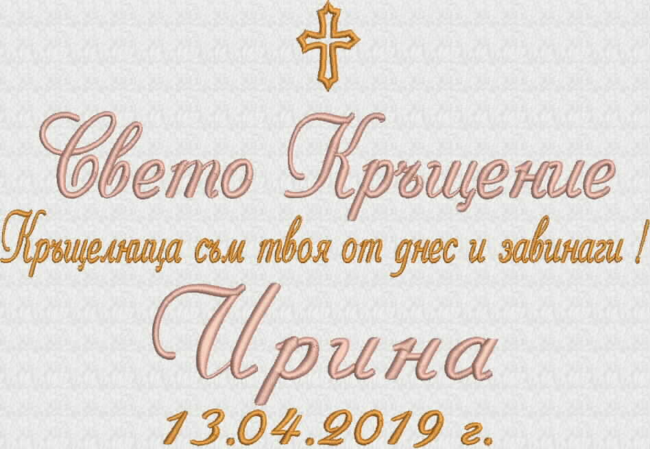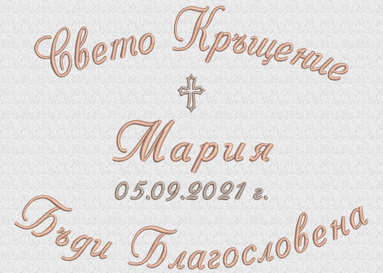 Избирате цвят на конците и стил на шрифта, така че вашата хавлия с бродерия да бъде уникална и съобразена с темата на събитието. Цветовите комбинации се изработват по заявка и позволяват пълно съответствие с останалите елементи от комплекта за свето кръщение.