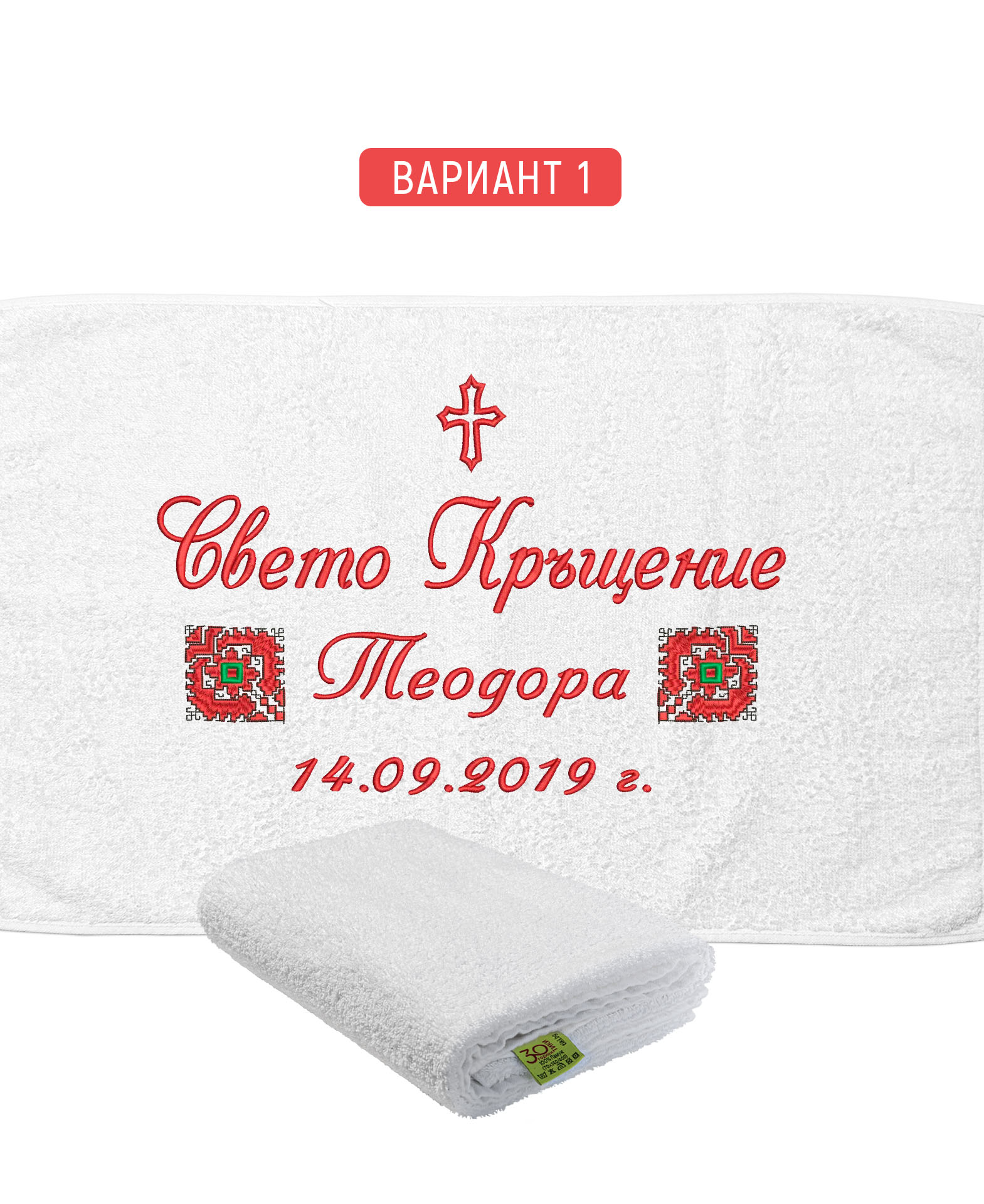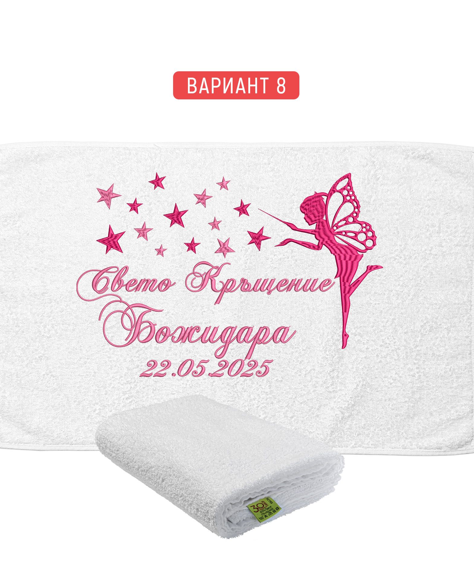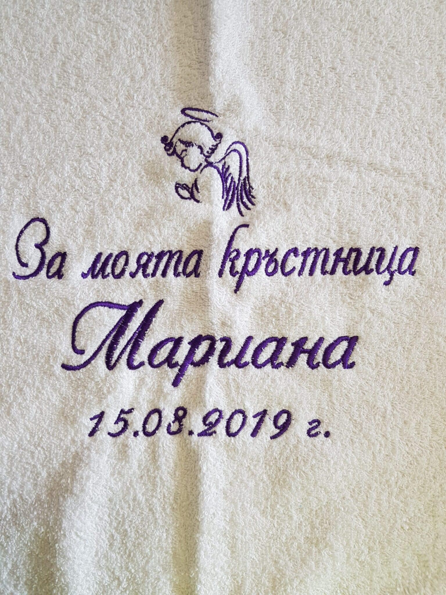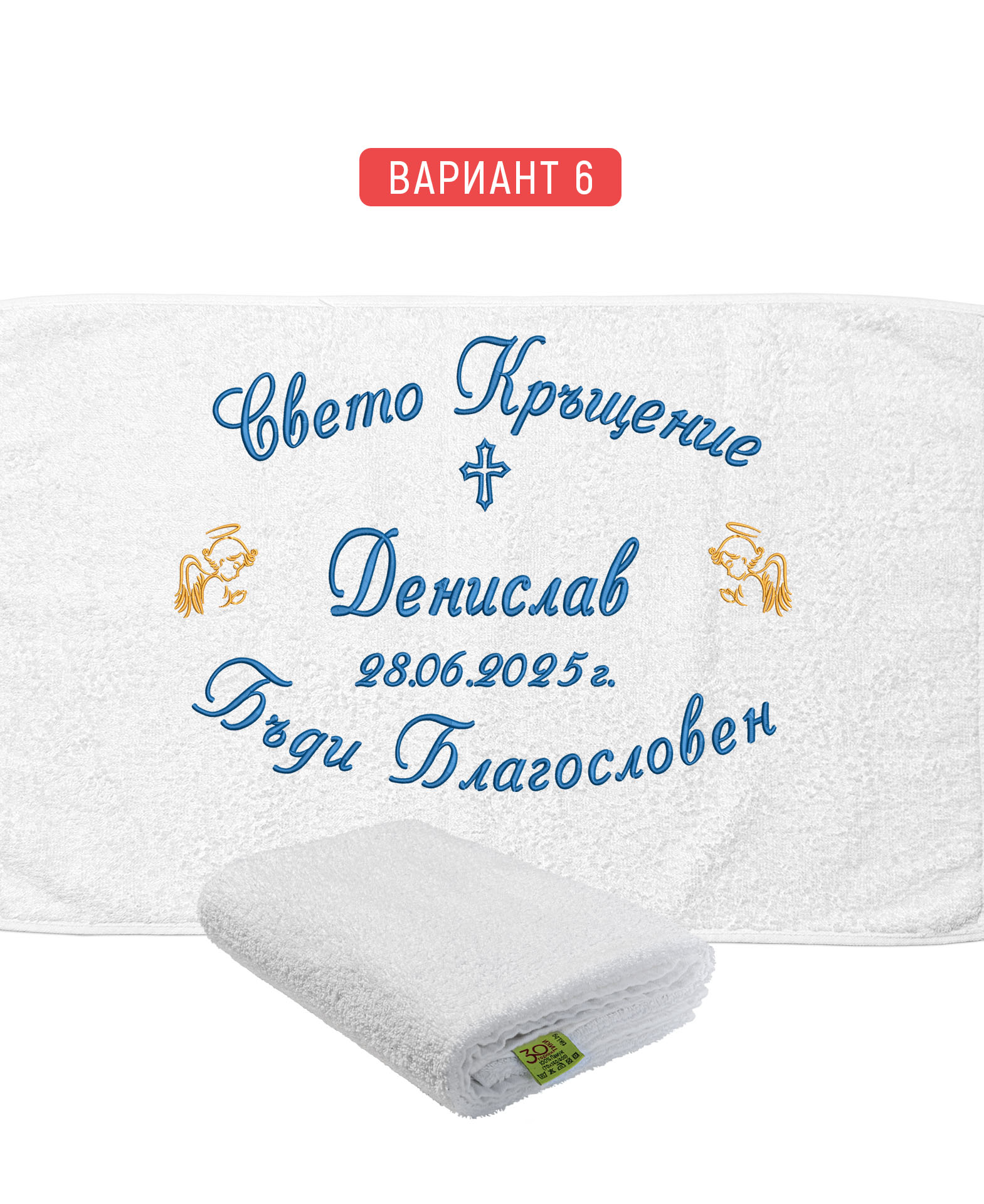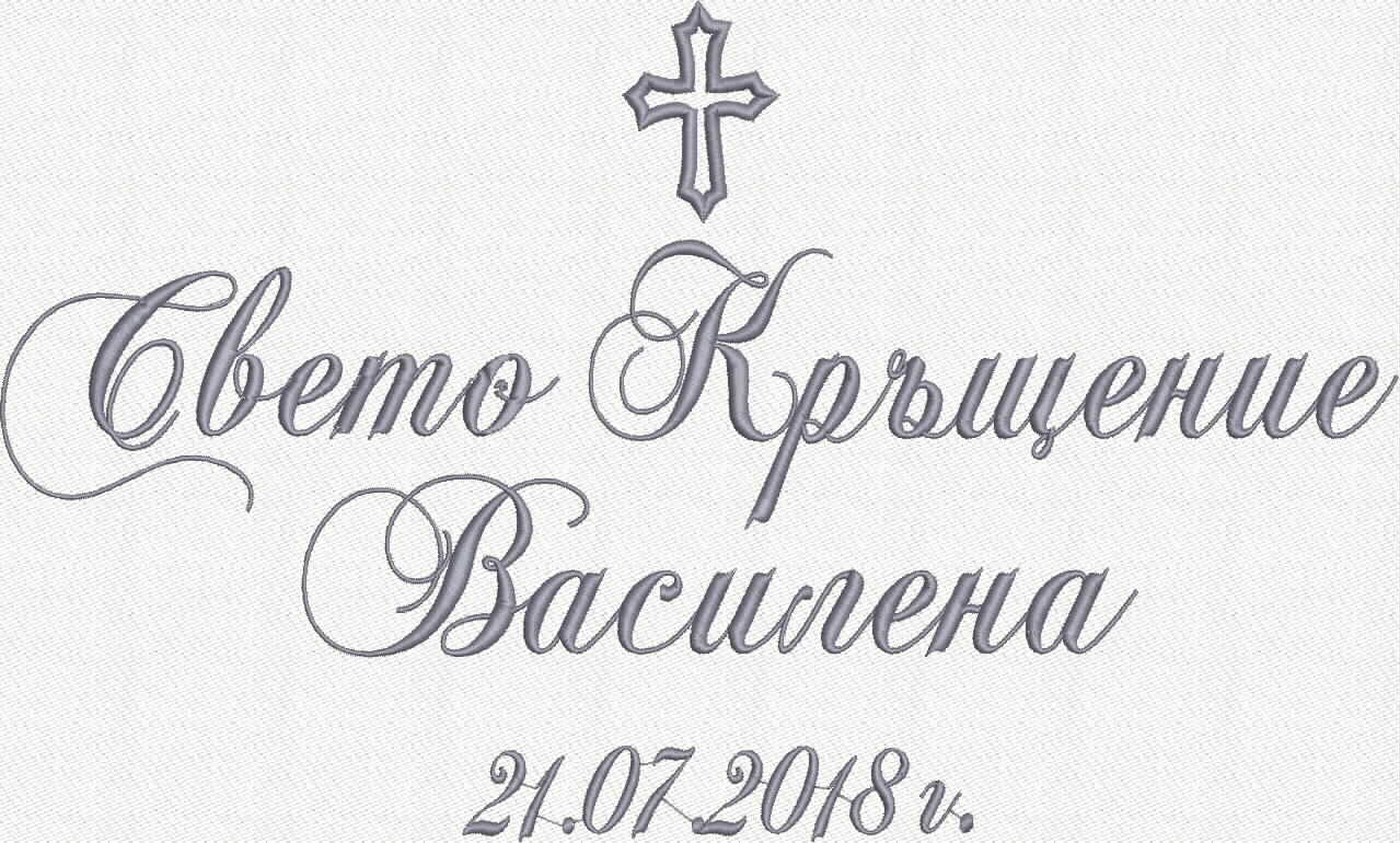 Избирате цвят на конците и стил на шрифта, така че вашата хавлия с бродерия да бъде уникална и съобразена с темата на събитието. Цветовите комбинации се изработват по заявка и позволяват пълно съответствие с останалите елементи от комплекта за свето кръщение.