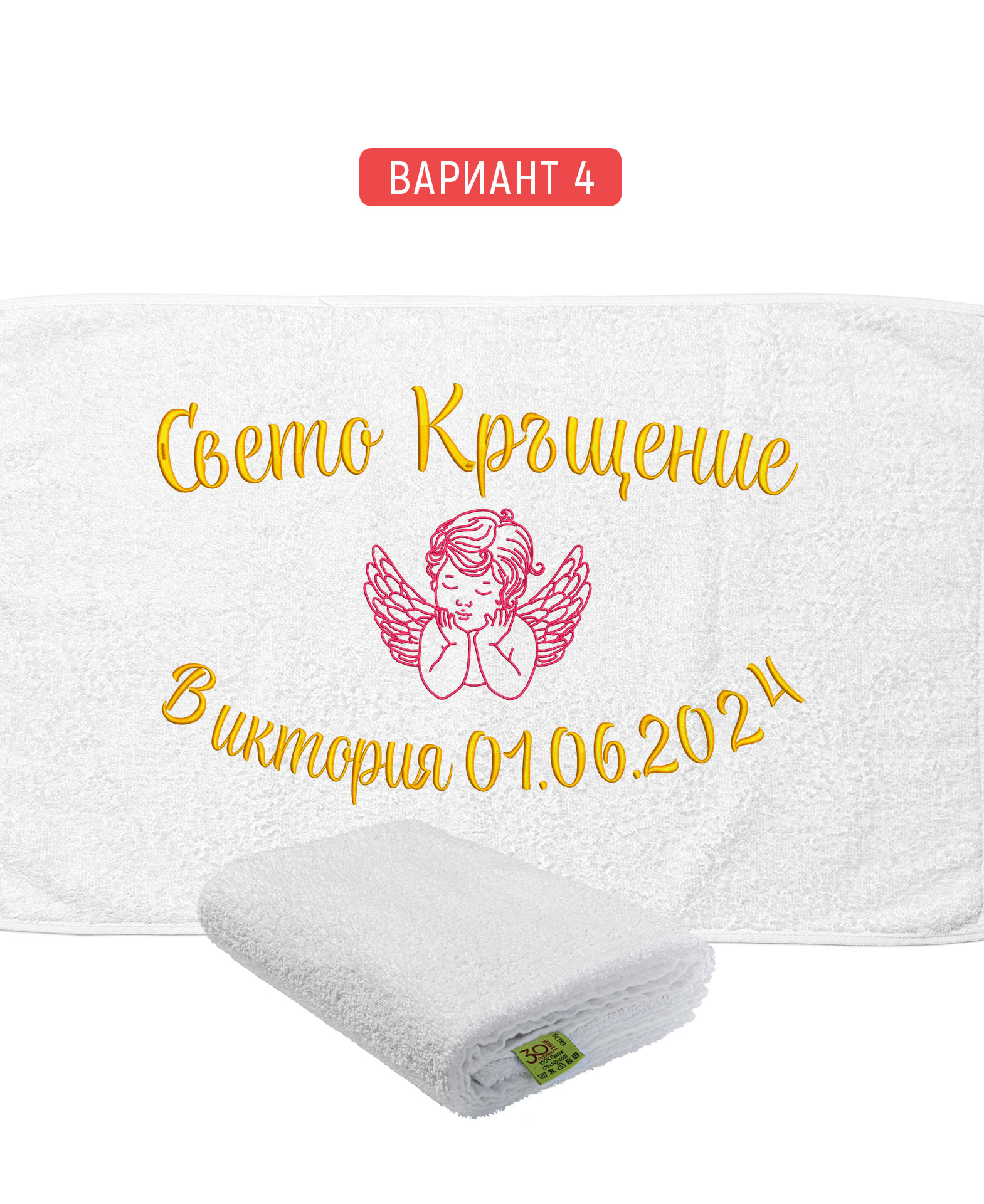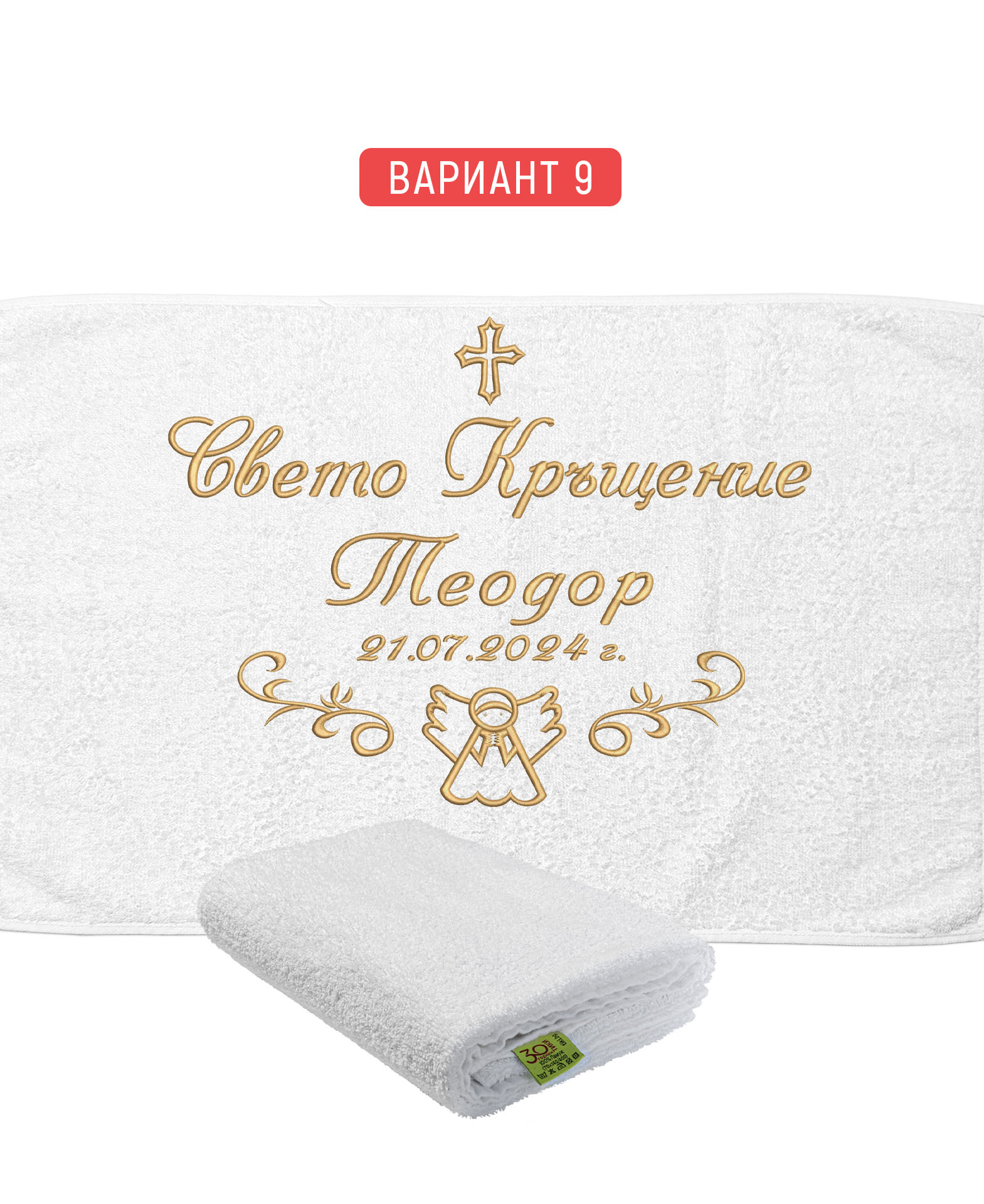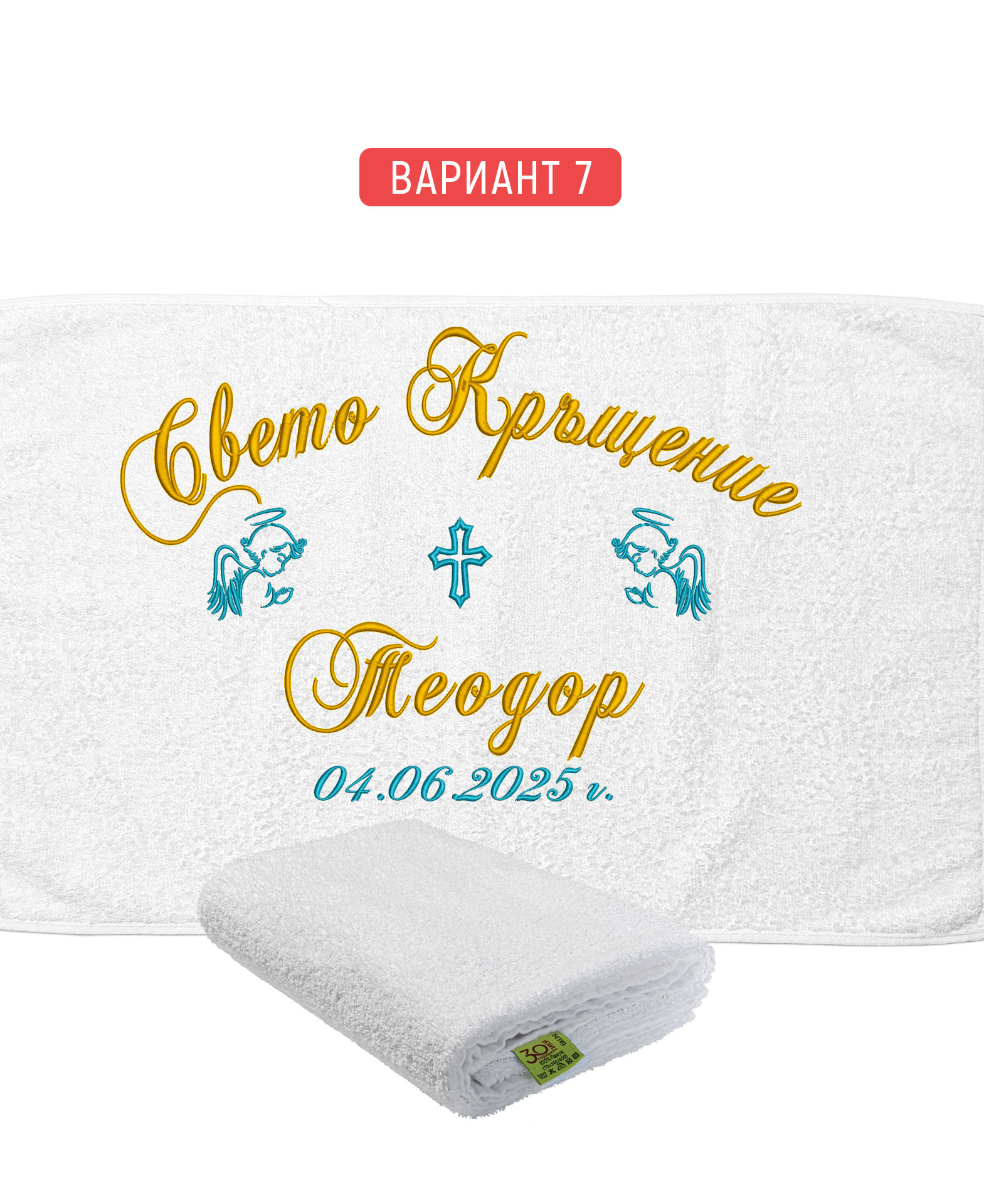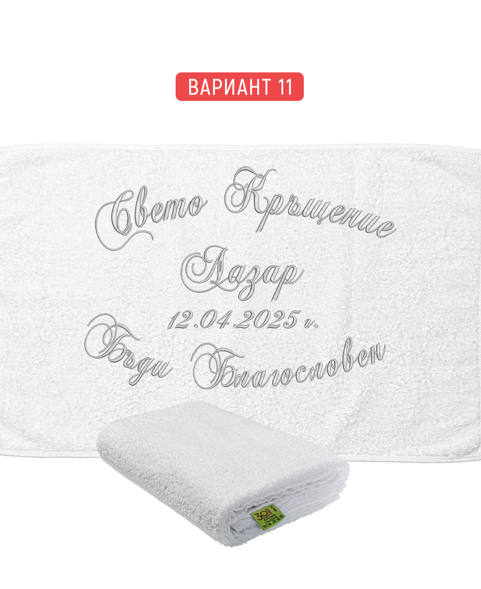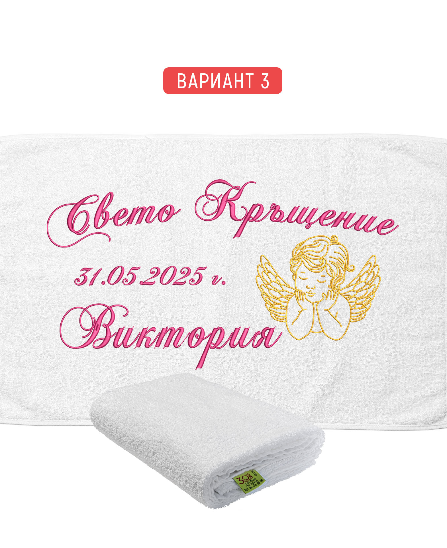 Избирате цвят на конците и стил на шрифта, така че вашата хавлия с бродерия да бъде уникална и съобразена с темата на събитието. Цветовите комбинации се изработват по заявка и позволяват пълно съответствие с останалите елементи от комплекта за свето кръщение.