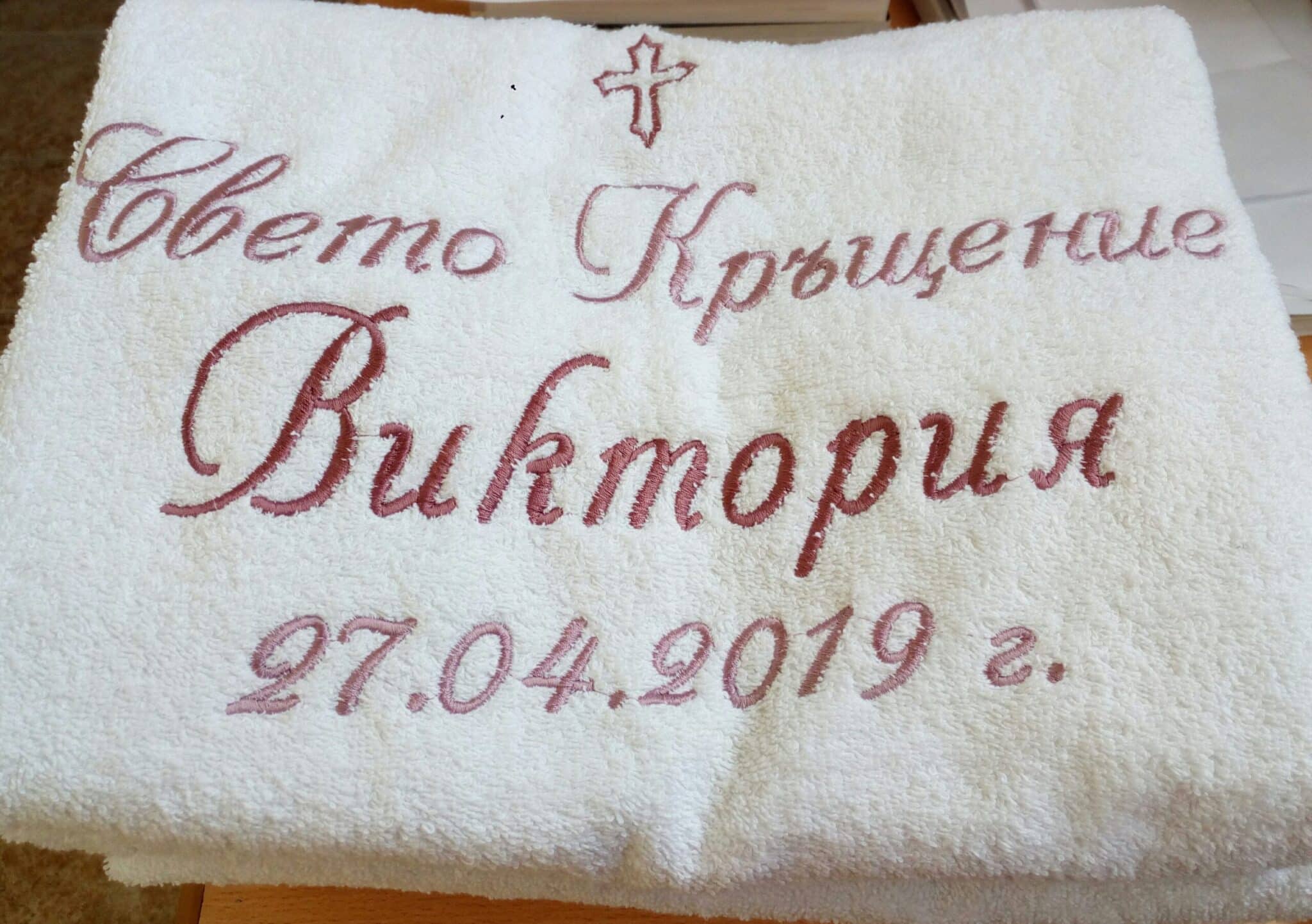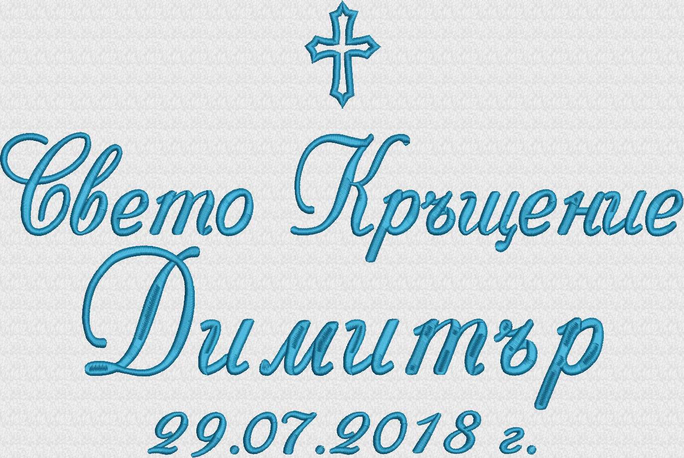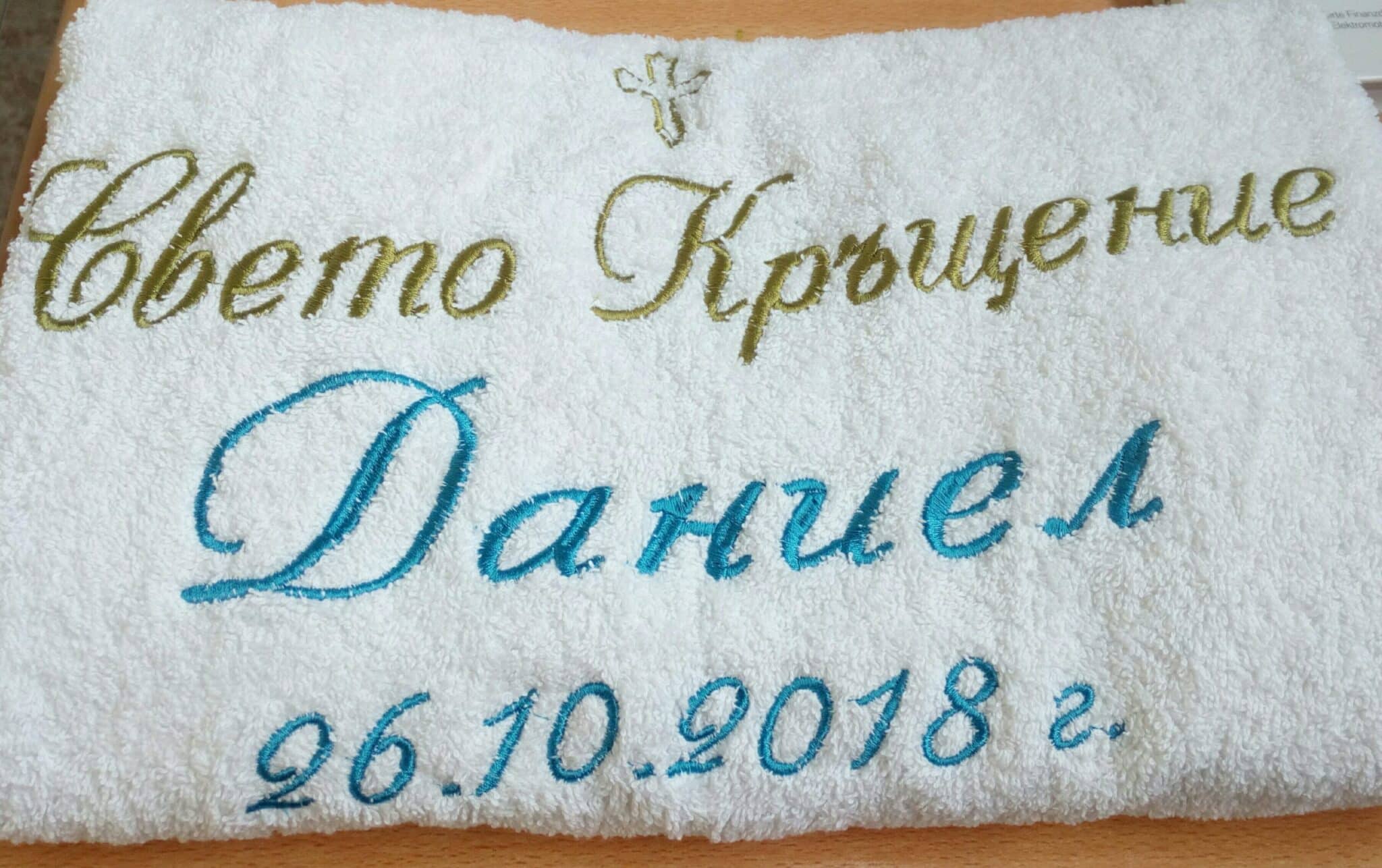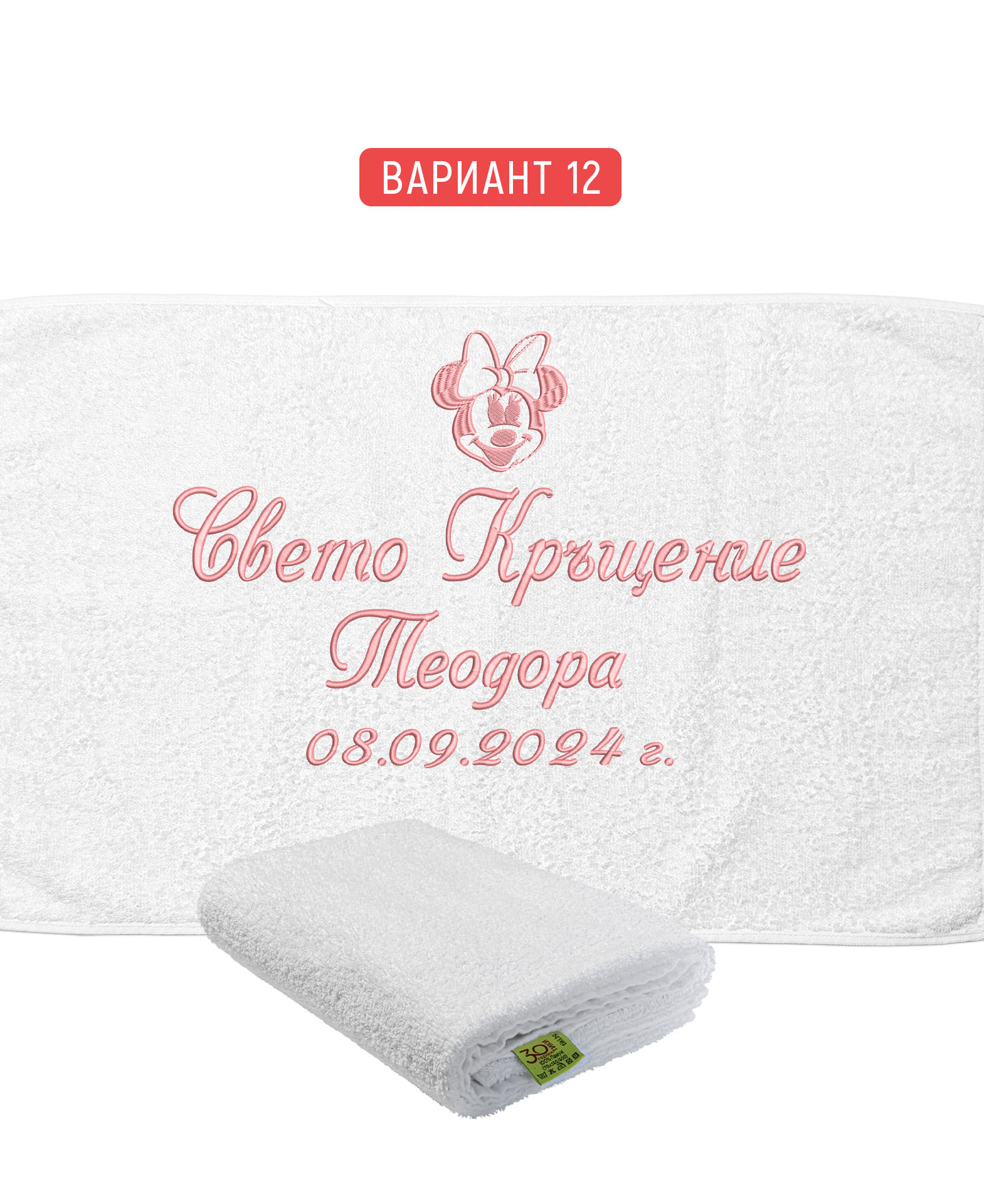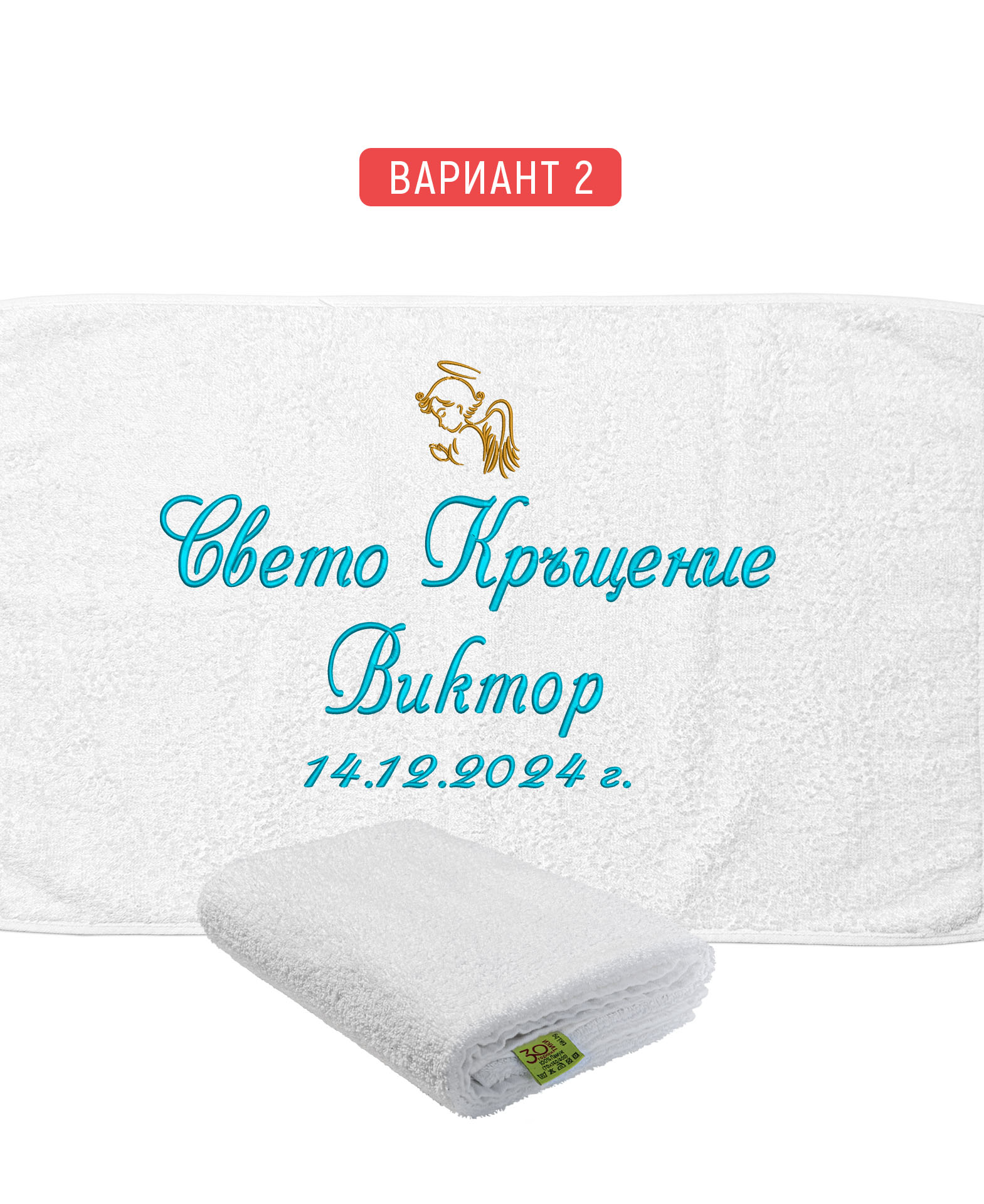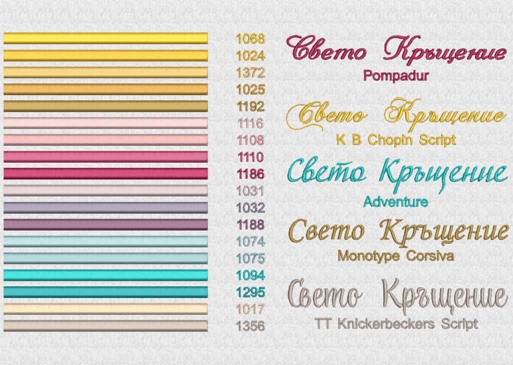 Избирате цвят на конците и стил на шрифта, така че вашата хавлия с бродерия да бъде уникална и съобразена с темата на събитието. Цветовите комбинации се изработват по заявка и позволяват пълно съответствие с останалите елементи от комплекта за свето кръщение.