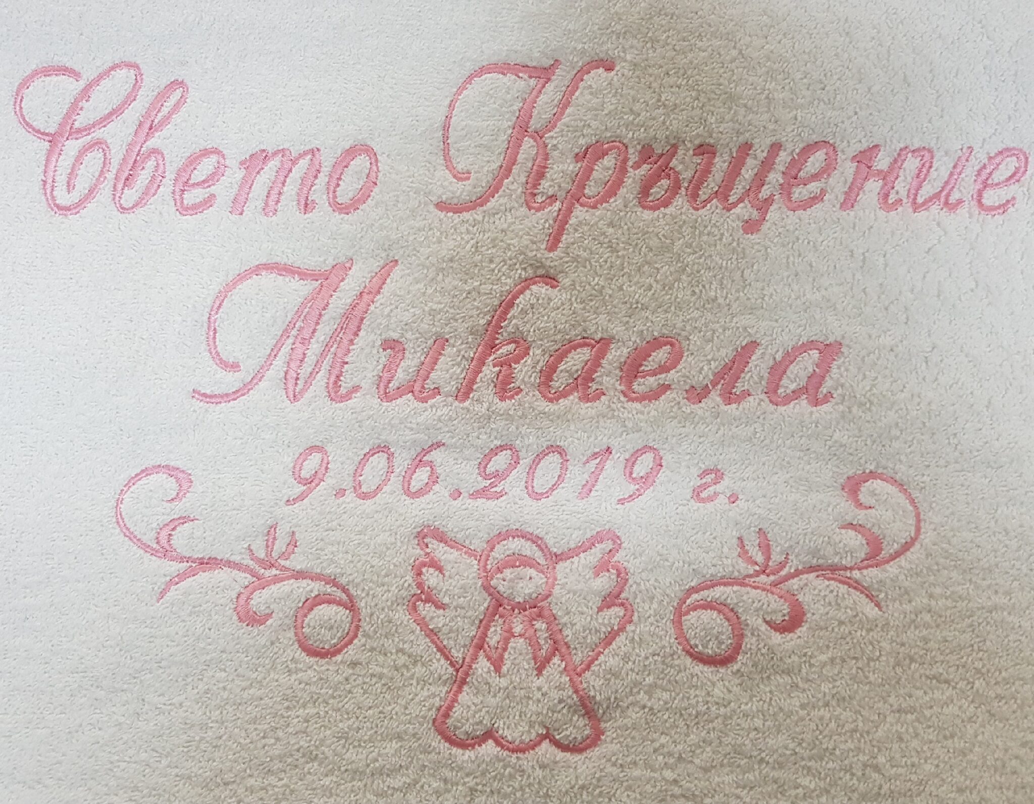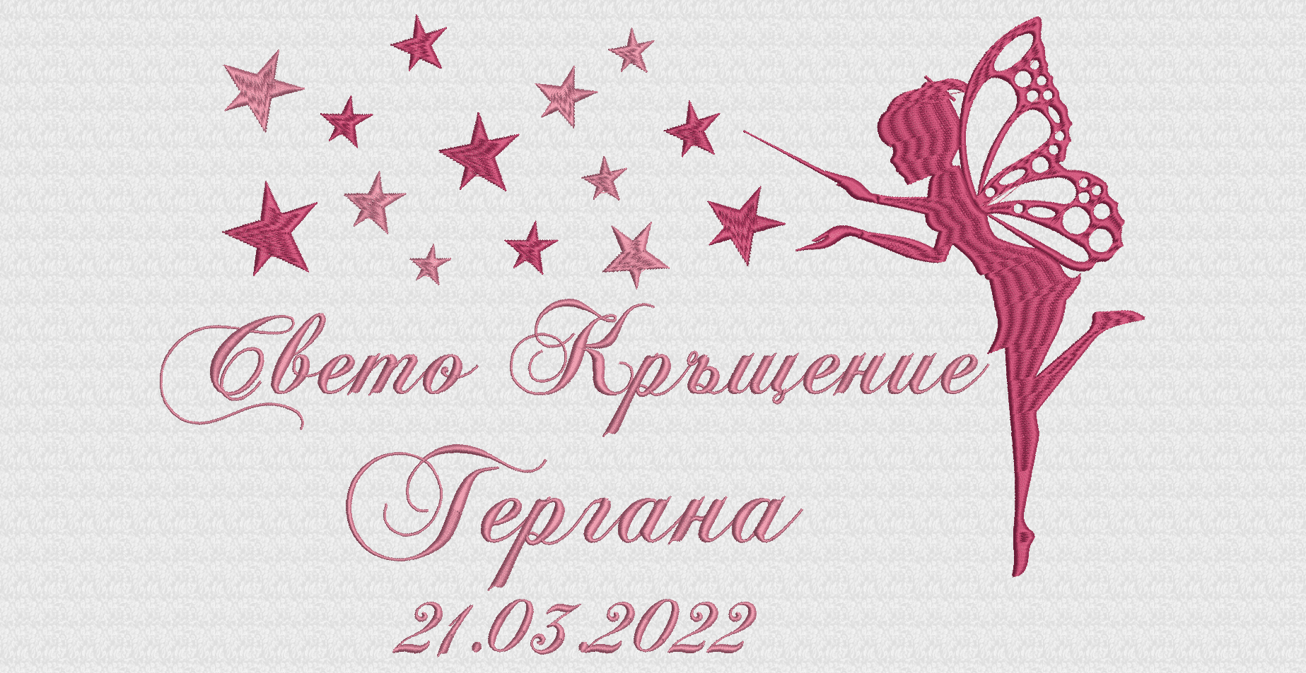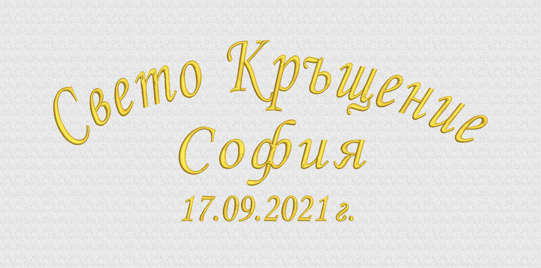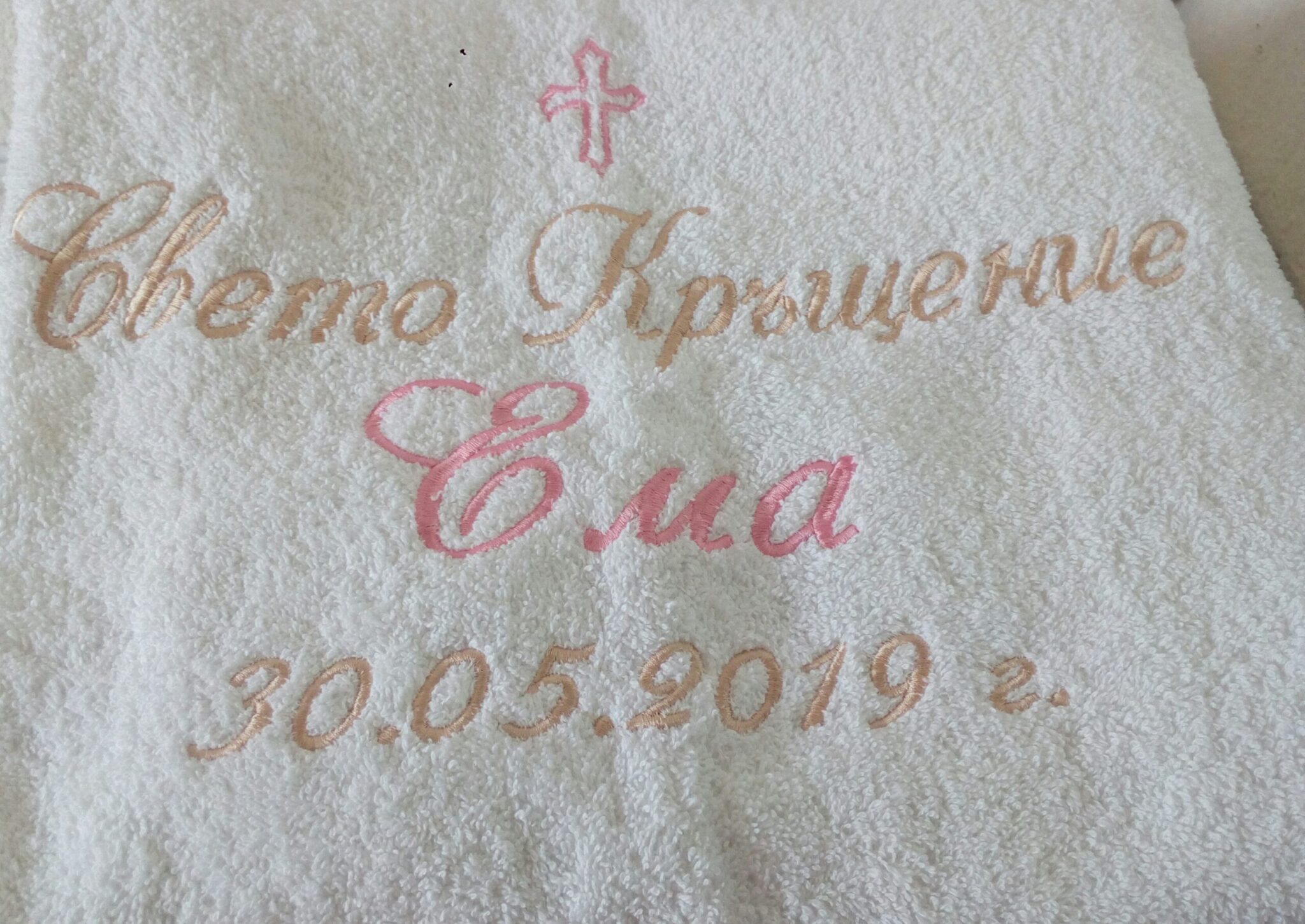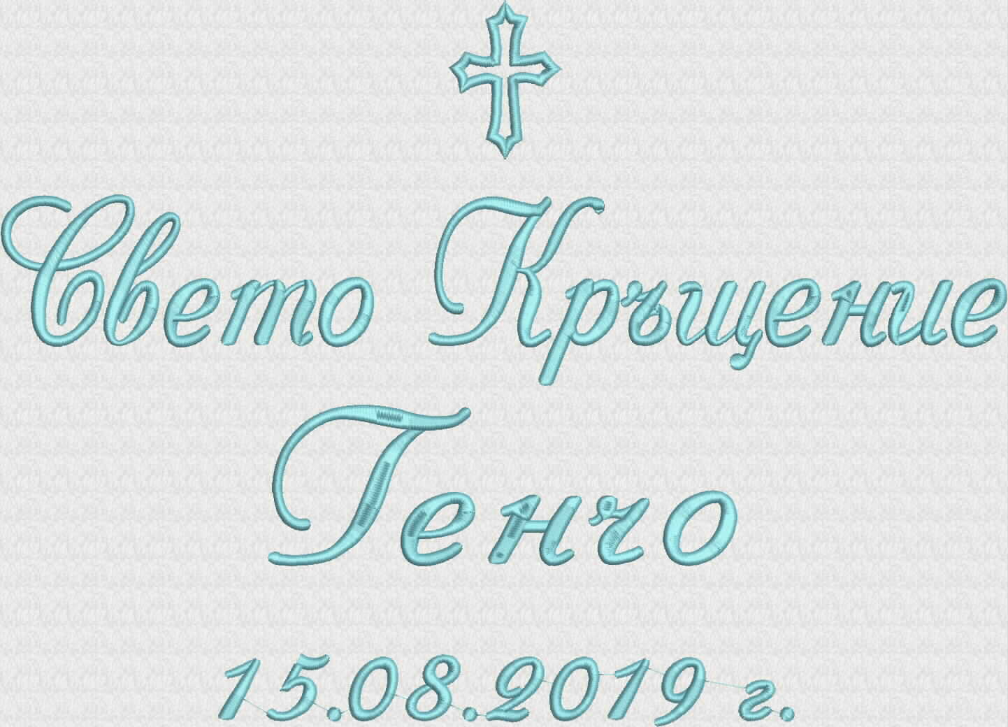 Избирате цвят на конците и стил на шрифта, така че вашата хавлия с бродерия да бъде уникална и съобразена с темата на събитието. Цветовите комбинации се изработват по заявка и позволяват пълно съответствие с останалите елементи от комплекта за свето кръщение.