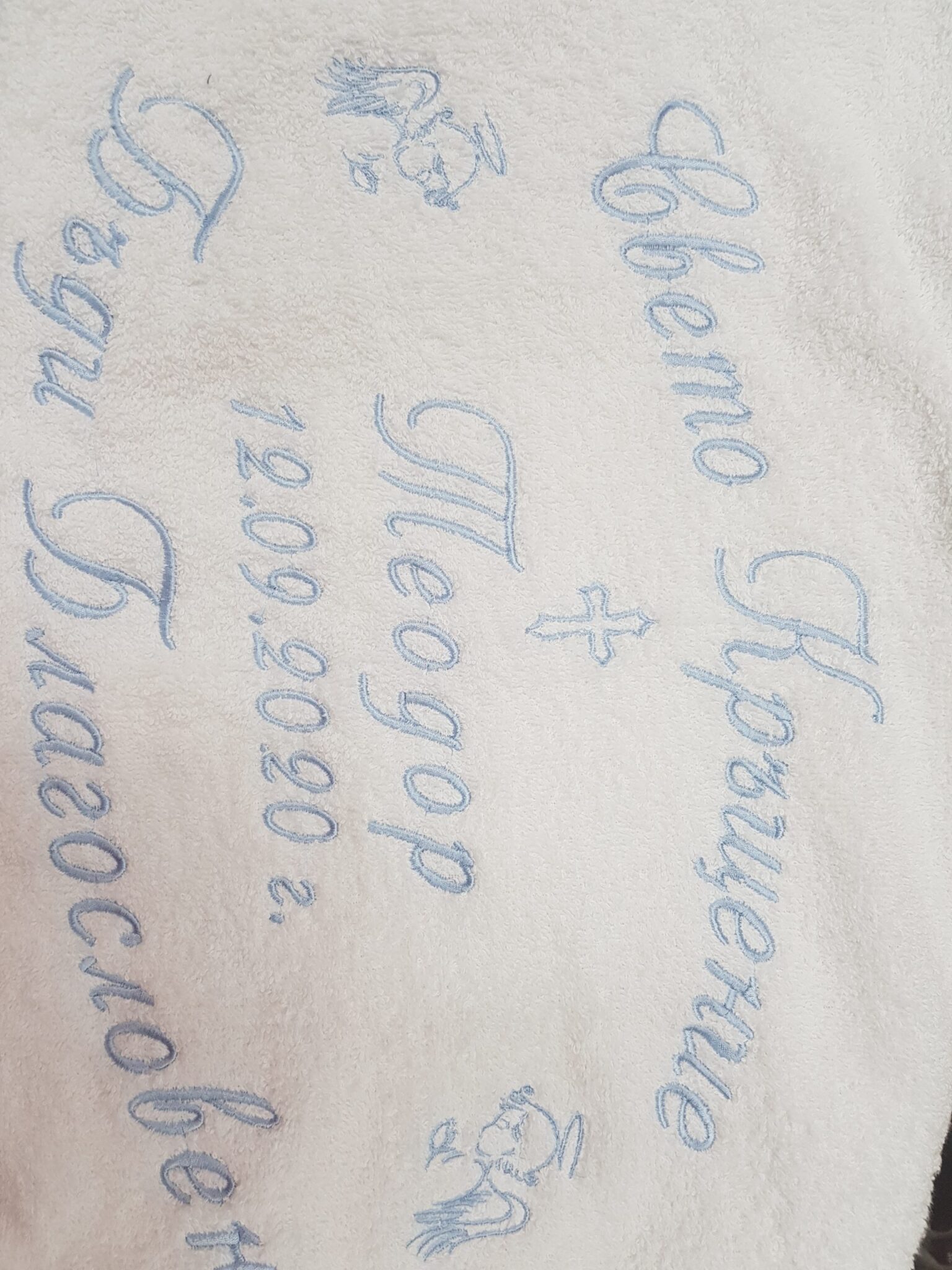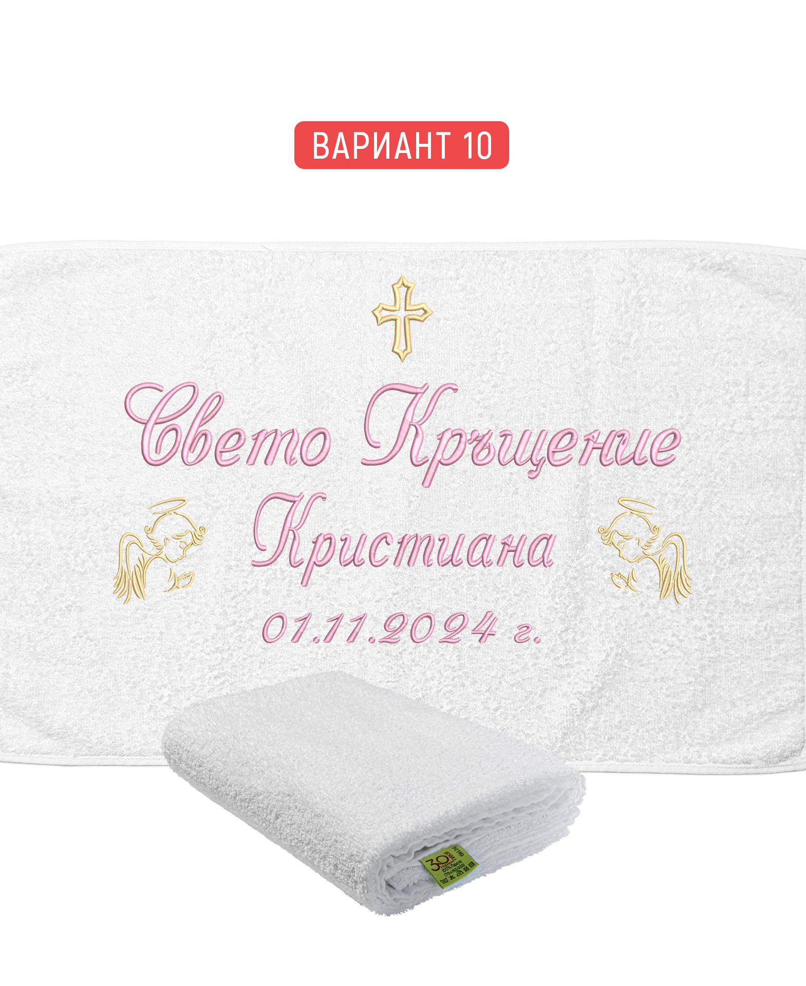 Бяла хавлиена кърпа от 100% памук с бродерия за кръщене. Посочената цена е за хавлия с бродерия в 12 варианта. Разгледайте шаблоните в галерия на продукта. Имате възможност да избирате от комбинации: