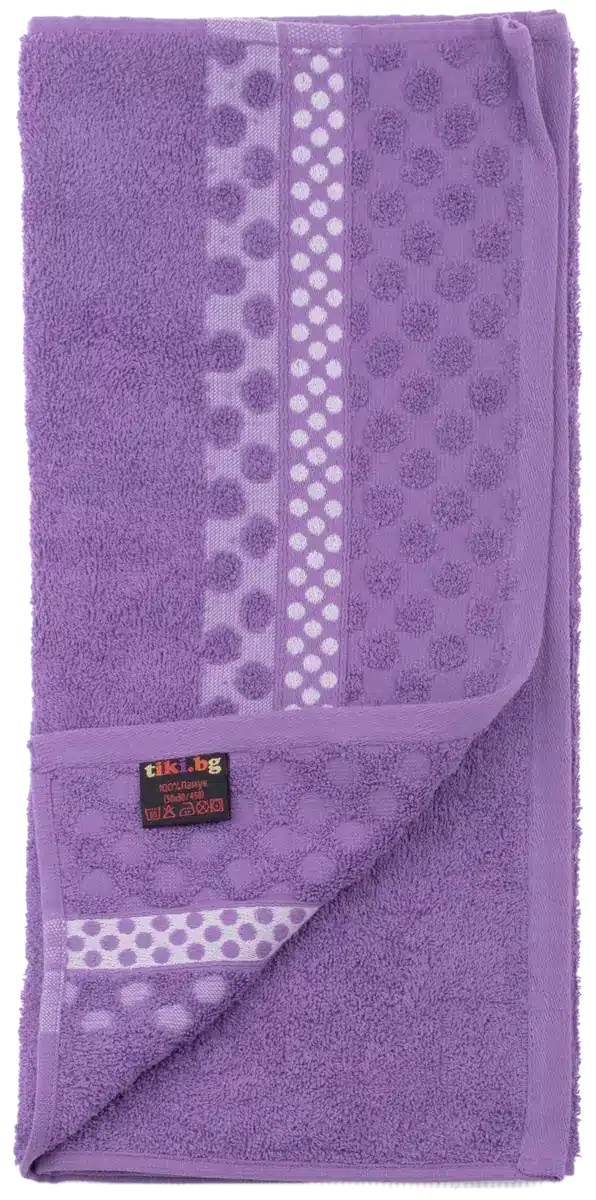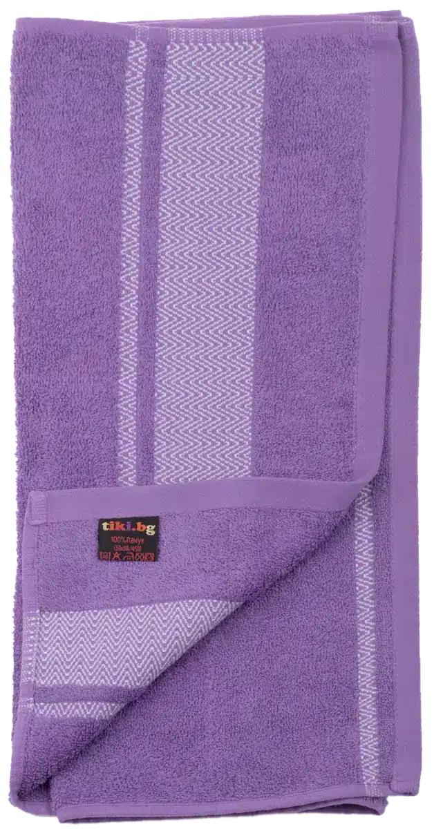 Хавлиена кърпа в цвят лилав изработена от 100% памук. Размера на кърпата е 50х90 см, а плътността е 450 г/м2. Тази хавлиена кърпа са предлага в два дизайна на борда – точки и зигзаг. Хавлиената кърпа в лилав цвят е много мека и приятна на допир, с отлична попивателна способност. Хавлията е перфектен избор както за ежедневна употреба у дома, така и за къщи за гости, козметични салони и много други. За комплект от две кърпи – голяма с размер 70х140 см. и средна с размер 50х90 см, поръчайте от тук голяма лилава хавлиена кърпа.
