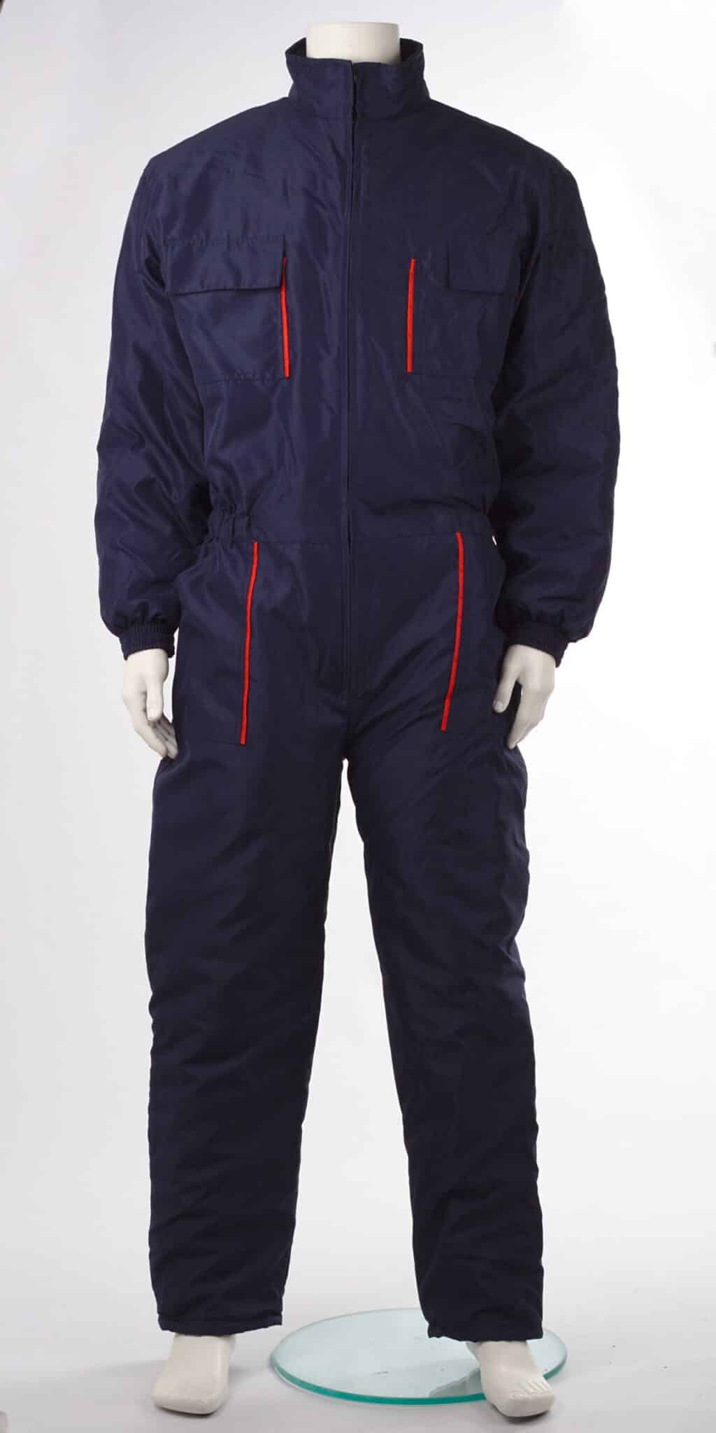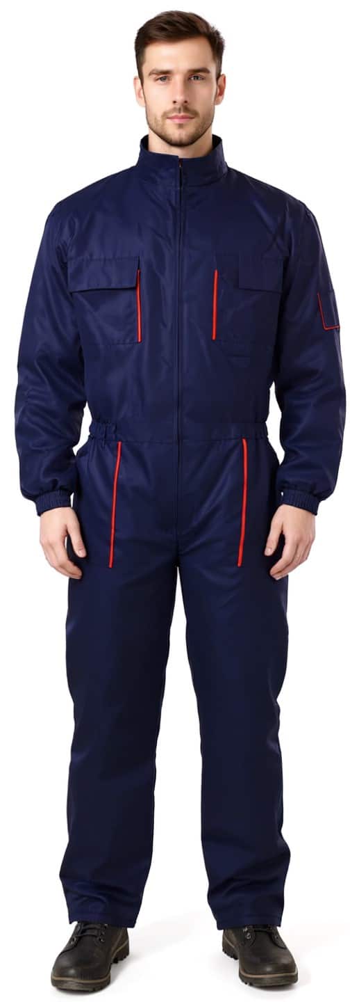 Цял работен гащеризон ватиран модел от промазка в тъмносин цвят с червени елементи. Има удобна и ергономична кройка. Моделът е изработен с общо шест джоба. Има два горни джоба на гърдите с капаци и велкро. Оборудван е с още два обемни предни джоба, един заден и един инструментален джоб на крачолa. Закопчаването е отпред с цип покрит с пластрон, а на кръста има ластик. Ръкавите са завършени с ластични маншети за по голяма безопасност при работа с машини. Този модел е изключително подходящ за работници в автосервизи, както и за хора работещи навън през зимата. Цял гащеризон ватиран от промазка може да поръчате лесно онлайн. Предлагаме този артикул и във вариант от материя 100% памук. Ползваме услугите на куриери Спиди и Еконт с изгодни цени за доставка.