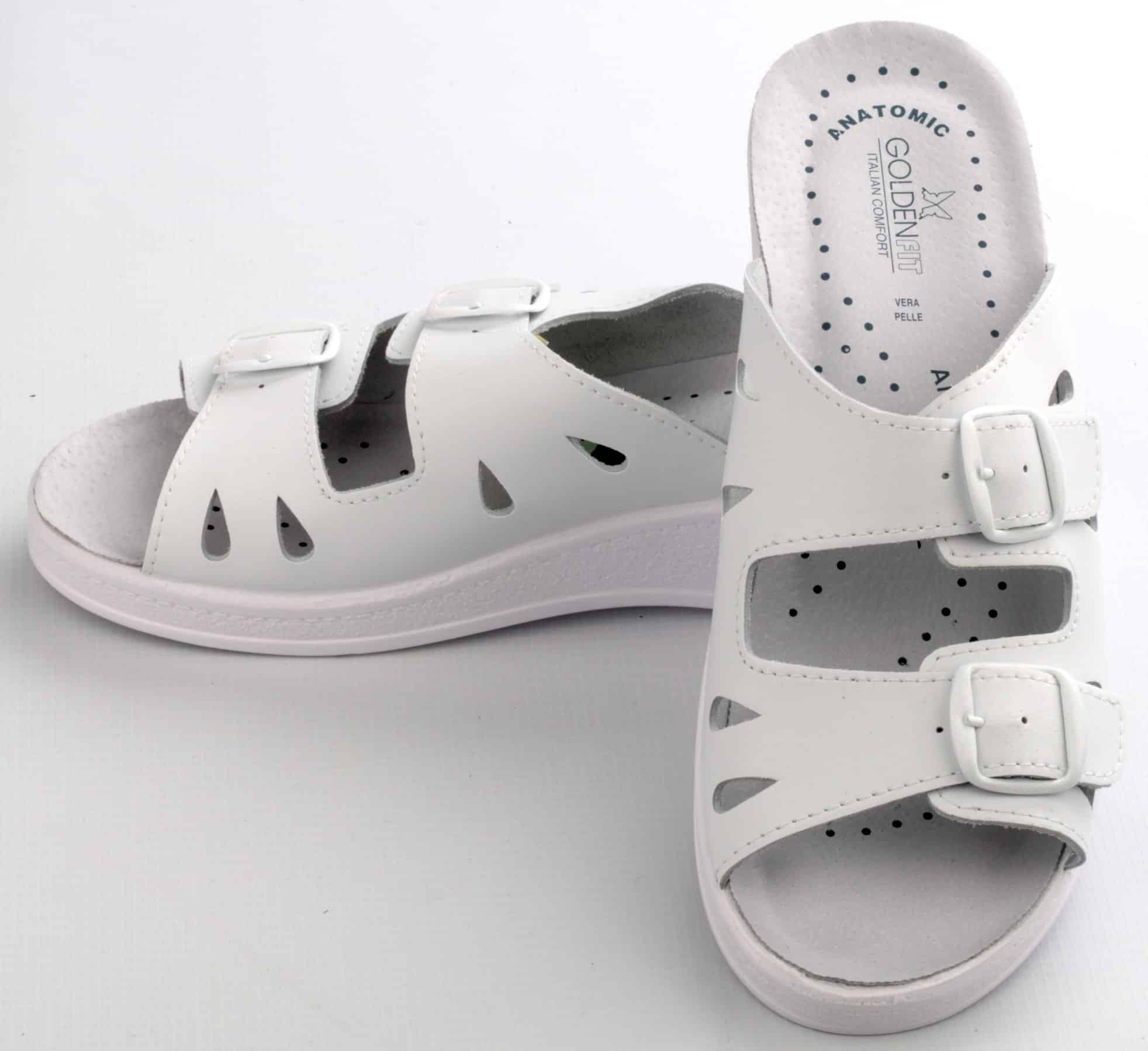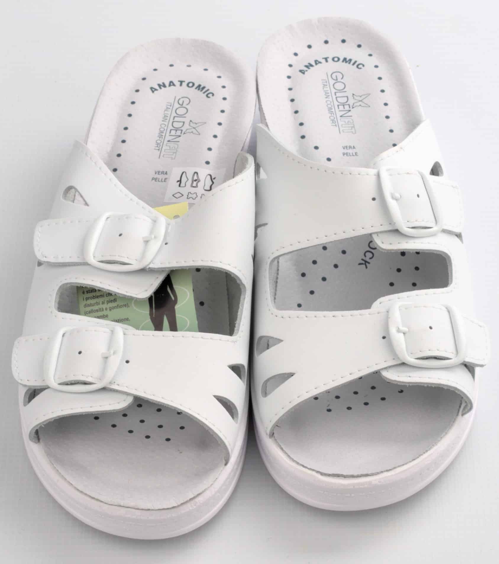 Чехли дамски GF Diamond бели на цвят. Произведени са в Италия. Изработени са от естествена кожа, с анатомично противошоково ходило и полиуретанова подметка. Височината на платформата в най-задната част е 4,5 см. Широчината на чехлите може да бъде регулирана с две отделни каишки с катарами. Моделът е допълнително подсилен с шевове. Чехли дамски GF Diamond са отличен избор за работни обувки при многочасова работа на крак. Подходящи са за медицински и санитарни работници, за фармацефти, за персонал в детски заведение, за фризьори и бармани. Чудесно приложение имат също и за лична употреба в ежедневието.
