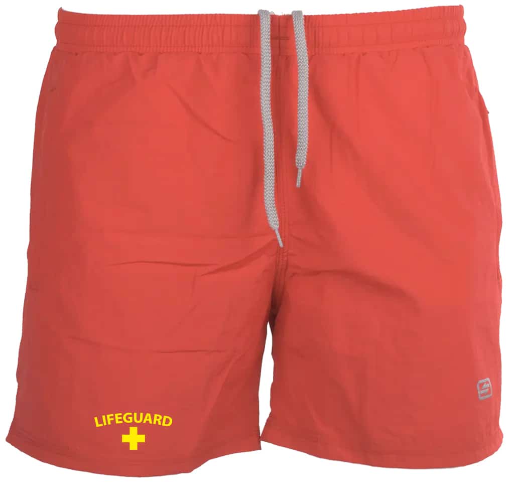 Шорти за спасител червени на цвят. Произведени са в България. Изработени са от лека материя със състав 100% полиестер, а от вътрешната страна имат мрежест бандаж. Подходящи за спасители при работа на открити и закрити басейни, както и за лична употреба в ежедневието. Моделът има ластик на кръста, връзки и два джоба, които се закопчават с ципове. По желание може да добавите надпис Lifeguard на десния крачол по средата в долната част. Надписът се изработва в жълт цвят. При смяна на цвета на надписа се доплаща допълнително.