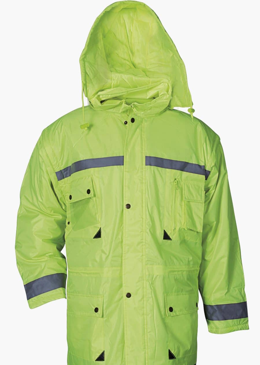 Ватирана непромокаема шуба, сигнална, зелена на цвят. Модел със свалящи се ръкави и светлоотразителни ленти. Шубата е изработена в зелен неон от полиестер/PVC и е подходяща част от вашето работно облекло или туристическа екипировка. Отлична е при работа в среда с намалена визимост, или при работа нощем.