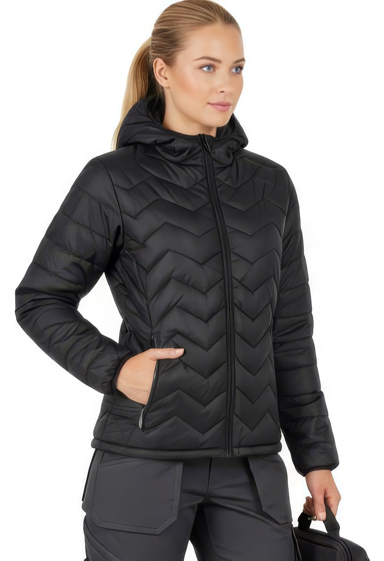 Ватирано дамско яке Флаш Нео черно на цвят. Изработено е от шушлякова материя и е капитонирано на зиг-загообрази ивици. Има два джоба и полиестерна подплата. Якето се закопчава отпред по средата с цип, а качулката и ръкавите имат ластичен завършек. Моделът е изключително лек и удобен както за работа, така и за ежедневието ви. От нас може да поръчате дамско яке Флаш Нео освен черно, също така червено и в цвят петрол. За да си осигурите максимален комфорт по време на работа през студените месеци от годината, към якето може да добавите ватирана блуза, или зимна шапка и зимни работни ръкавици.