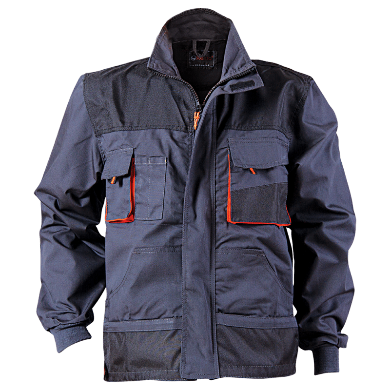 Работно яке модел Емертон в сиво с черно и оранжеви елементи. Моделът е снабден с подсилени лакти и с шест джоба отпред, два от които затворени с капак. Декориран е с елементи с висока видимост. За да завършите работната си униформа, предлагаме да комбинирате яке Емертон с панталон Емертон, или полугащеризон Емертон.