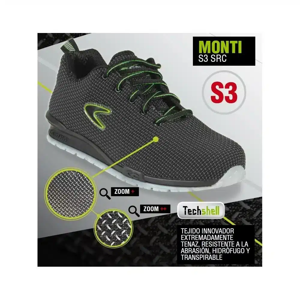 Висок клас работни обувки модел Cofra Monti S3 SRC. Саята на този модел е изработена от материя сертифицирана по системата TechShell. Което означава, че е преминала серия от изпитания за износване и разкъсване. Също така е дишаща и водоотблъксваща. Стелката е анатомична, антистатична и перфорирана. Изработена е от ароматизиран полиуретан. Долната част на стелката е с форма, която гарантира абсорбиране на енергията в областта на петата. Горната част на стелката абсорбира влагата и поддържа ходилото сухо. Подплатата е изработена от полиестерна тъкан, която е дишаща и антибактериална, а освен това абсорбира и освобождава влагата. Поръчайте онлайн обувки Cofra Monti S3 SRC за изключителен комфорт по време на работа и за гарантирана безопасност на ходилата ви. Нашите консултанти са на разположение за съвет в работно време на посочените телефони и имейл.